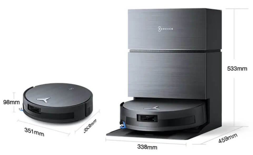 Для начала беглый обзор внешнего вида ECOVACS DEEBOT X11 PRO OMNI. Размеры у робота: 353*98 мм, станции: 338*459*533 мм. Тут всё стандартно.
