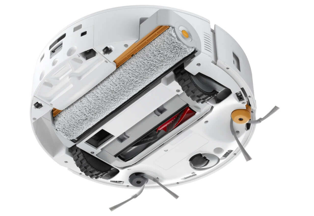 Сила всасывания тут 20 000 Па, что меньше, чем у Saros-версией, но тем не менее на уровне премиальных аналогов от других брендов. По центру видим щётку DuoDivide с защитой от наматывания волос, но более интересно то, что робот оснащен двумя боковыми щетками двухлучевой конструкции.