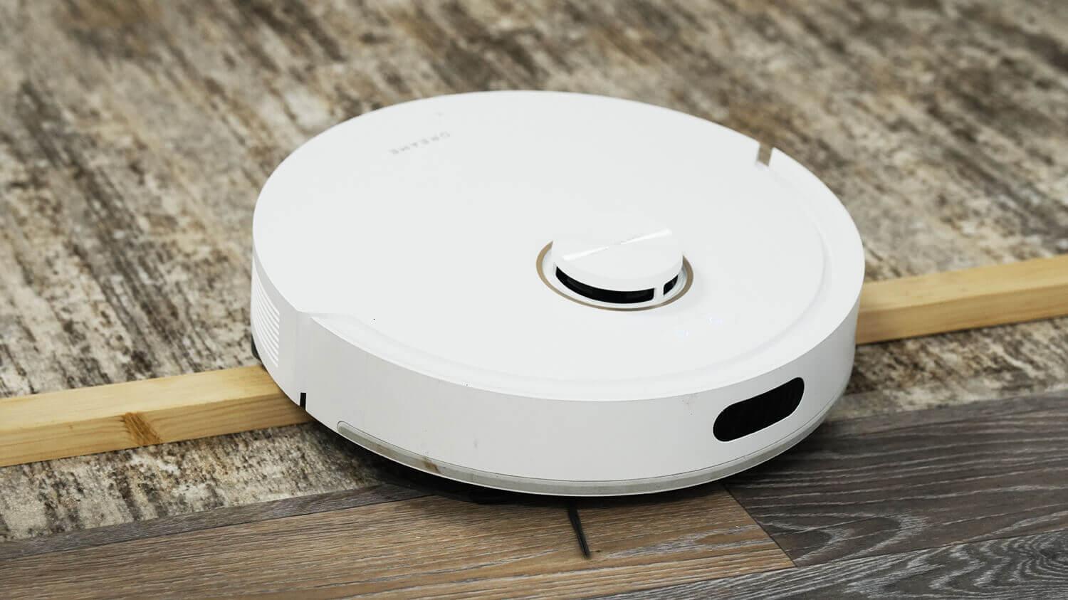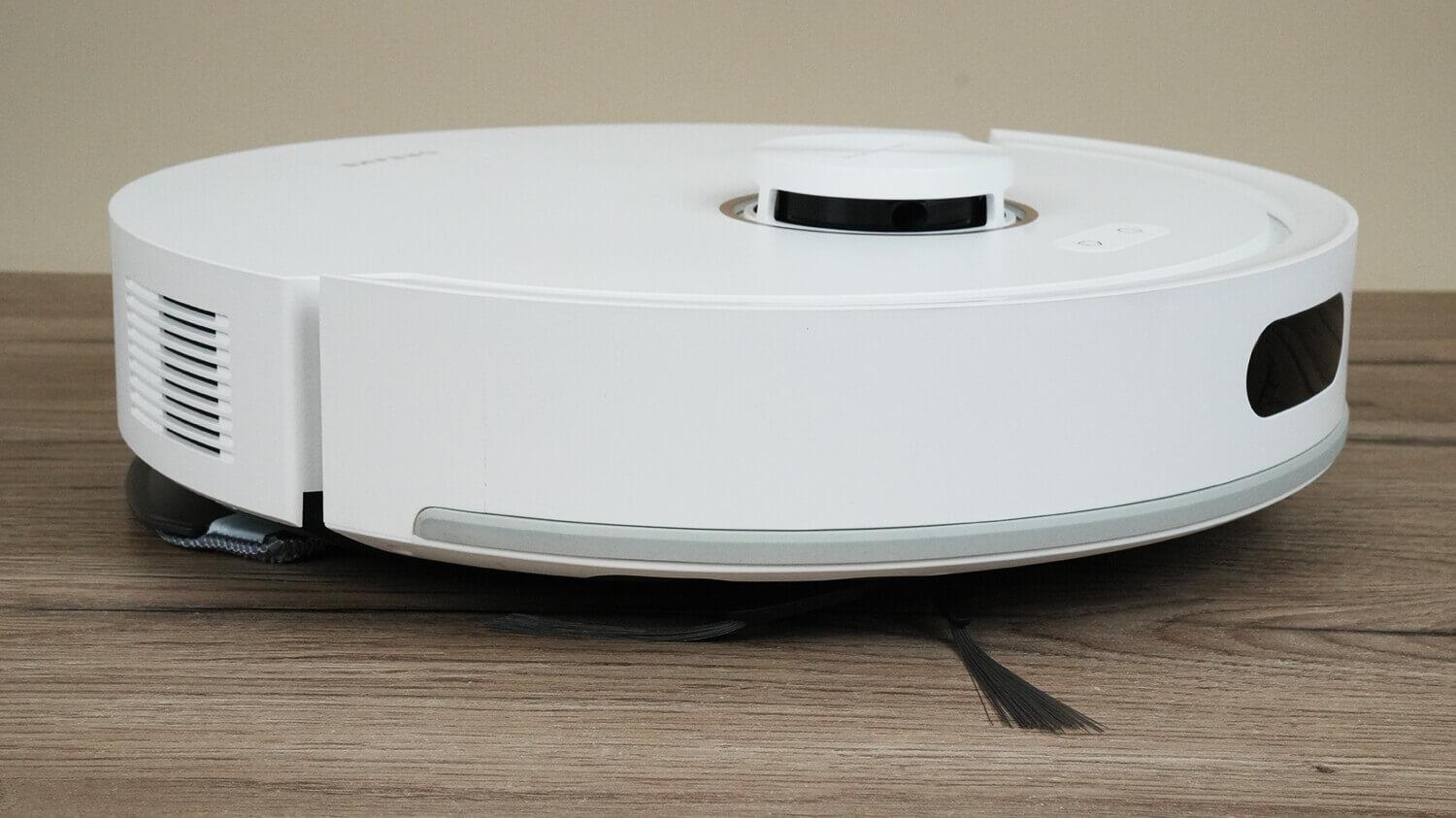 Теперь рассмотрим, как устроен Dreame F21 Plus. Он выпускается в белом цвете. Форма корпуса круглая. Высота заявлена 95 мм от пола, хотя фактически высота около 93 мм.