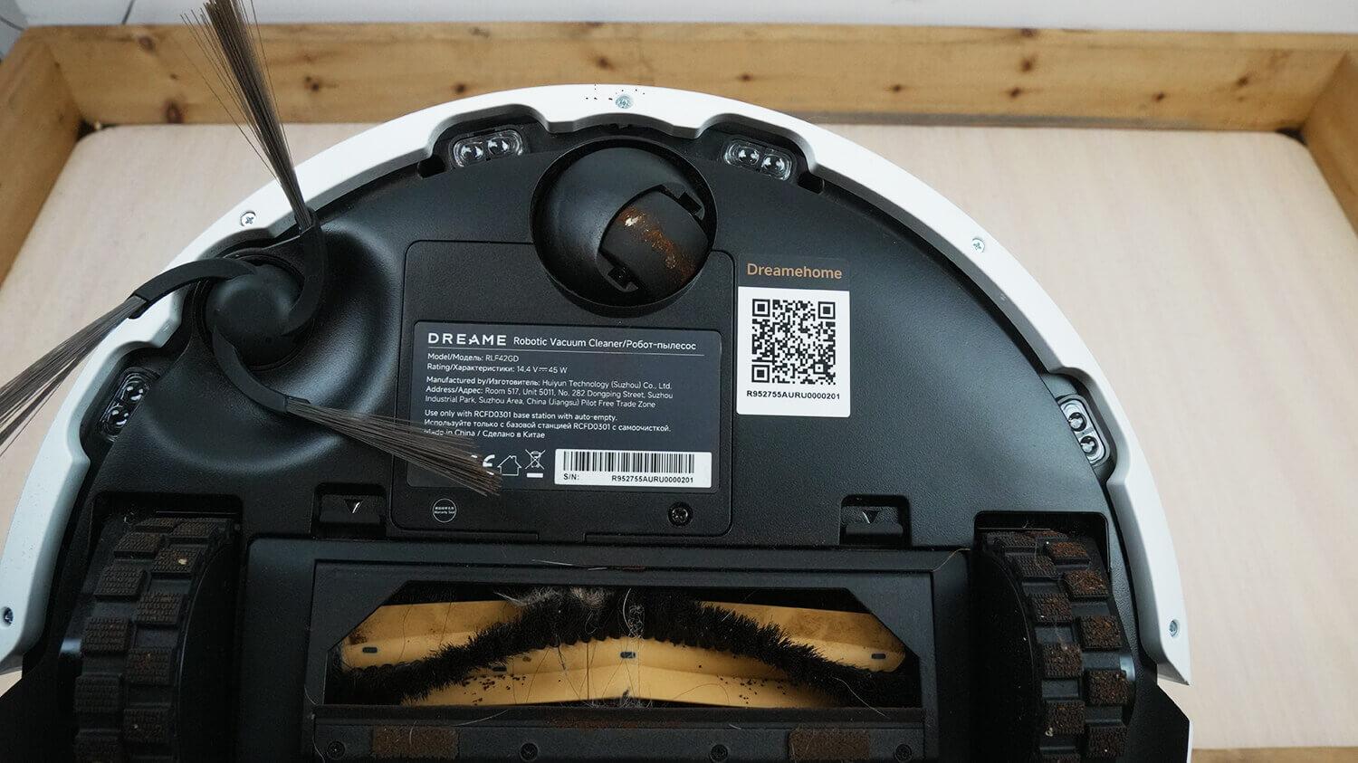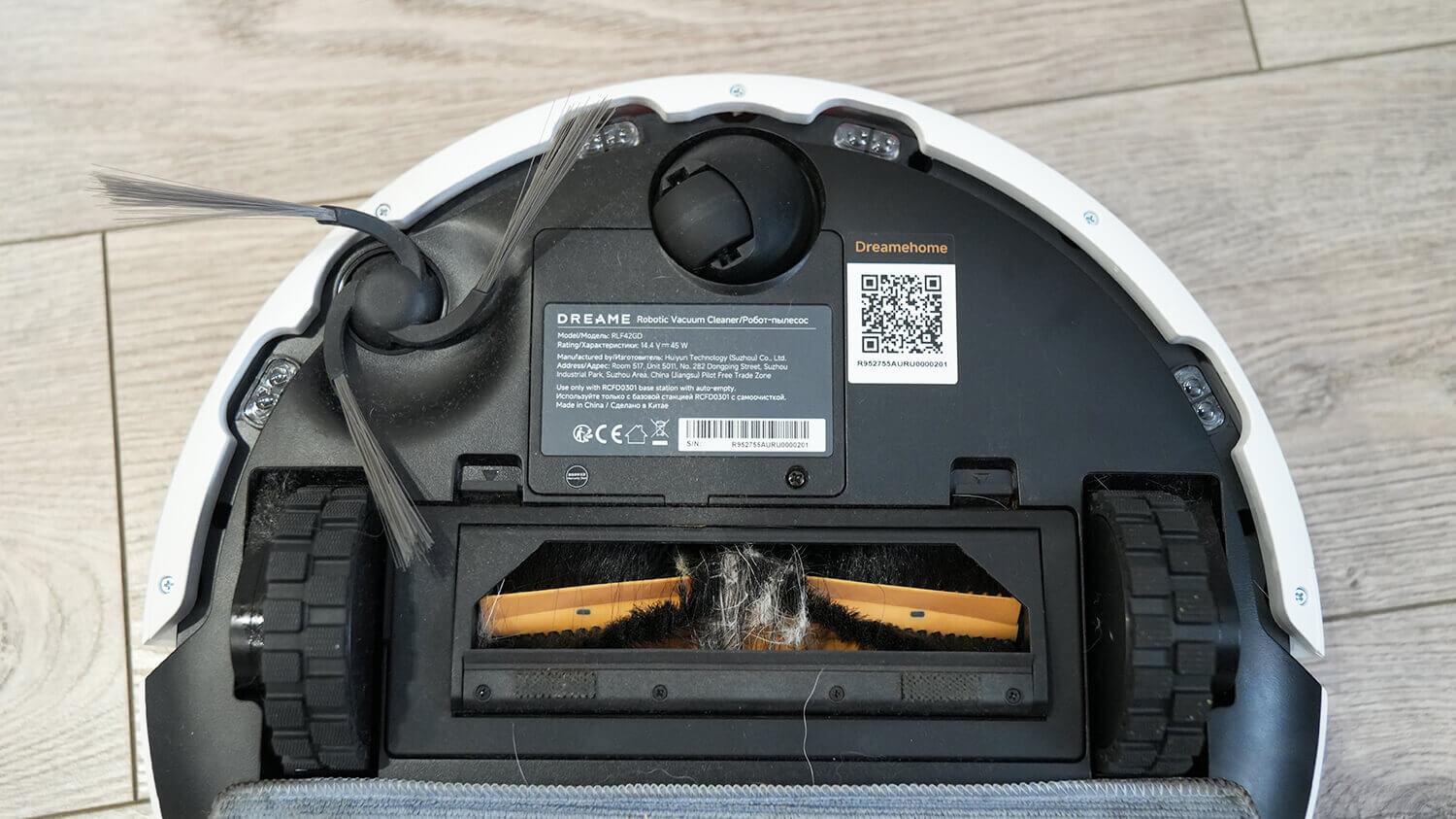 На дне робота установлено 4 датчика защиты от падения. Датчика ковра нет. Боковая щётка трёхлучевая, быстросъемная. Как уже говорилось, она обновленной конструкции. Кисточки стали длиннее, благодаря чему должна повыситься эффективность выметания мусора в углах.