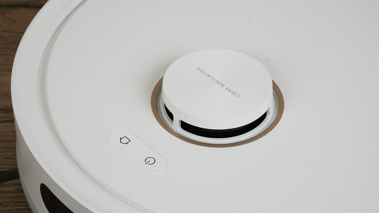 Лидар оснащен подпружиненной крышкой для защиты от застревания под мебелью. Рядом находится 2 механические кнопки управления.