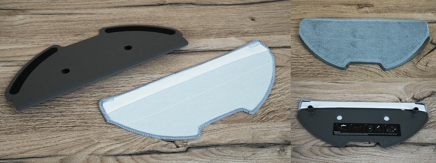 Снизу к роботу крепится держатель с салфеткой. Салфетка обычного исполнения, закреплена за счет карманов и липучек. Вода подается через два отверстия. Предусмотрена электронная регулировка подачи жидкости.