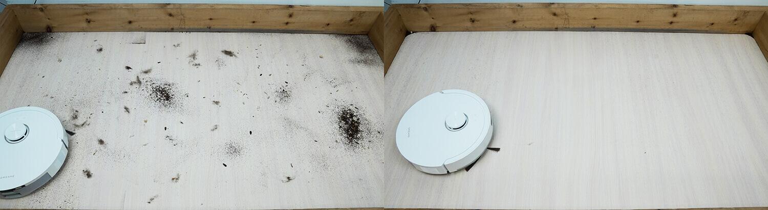 В реальности мощность повышенная у робота, но не такая, как указано в цифрах. Наблюдаются аэродинамические потери, в т.ч. из-за того, что блок центральной щётки не плавающий. Но интересно, что фактически робот показал лучше результат, чем обычный F21. Может как-то связано с пылесборником, который немного изменен, хотя обычно у самоочищающихся роботов наоборот мощность слабее из-за менее герметичной конструкции пылесборника.