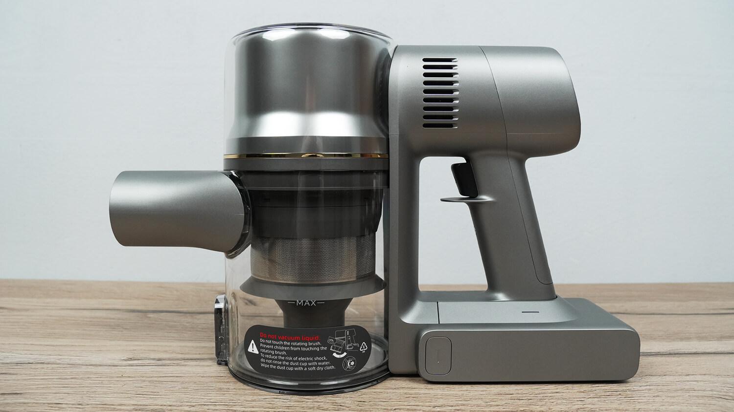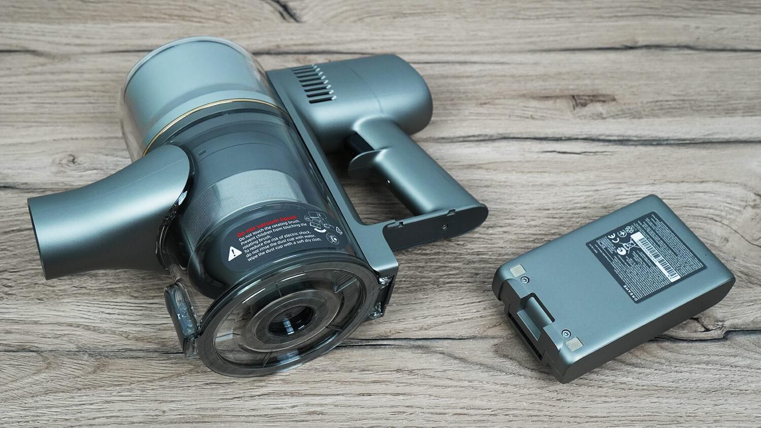 Теперь рассмотрим, как устроен Dreame R20 Essential. Он выполнен в привычном графитовом цвете. Внутри основного блока установлен 570-ваттный двигатель, развивающий силу всасывания до 190 аВт. Сравнивая с обычным R20 заявленная мощность не поменялась.