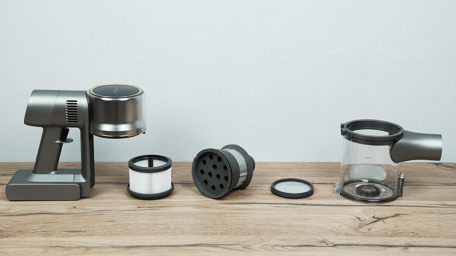 В завершение расскажу, как чистится пылесборник. Нажимаем на кнопку и весь мусор выпадает через дно. Если волосы и шерсть застрянут в колбе, можно снять пылесборник, извлечь систему фильтрации и вытряхнуть остатки содержимого из колбы, не контактируя руками с мусором. Удобно!