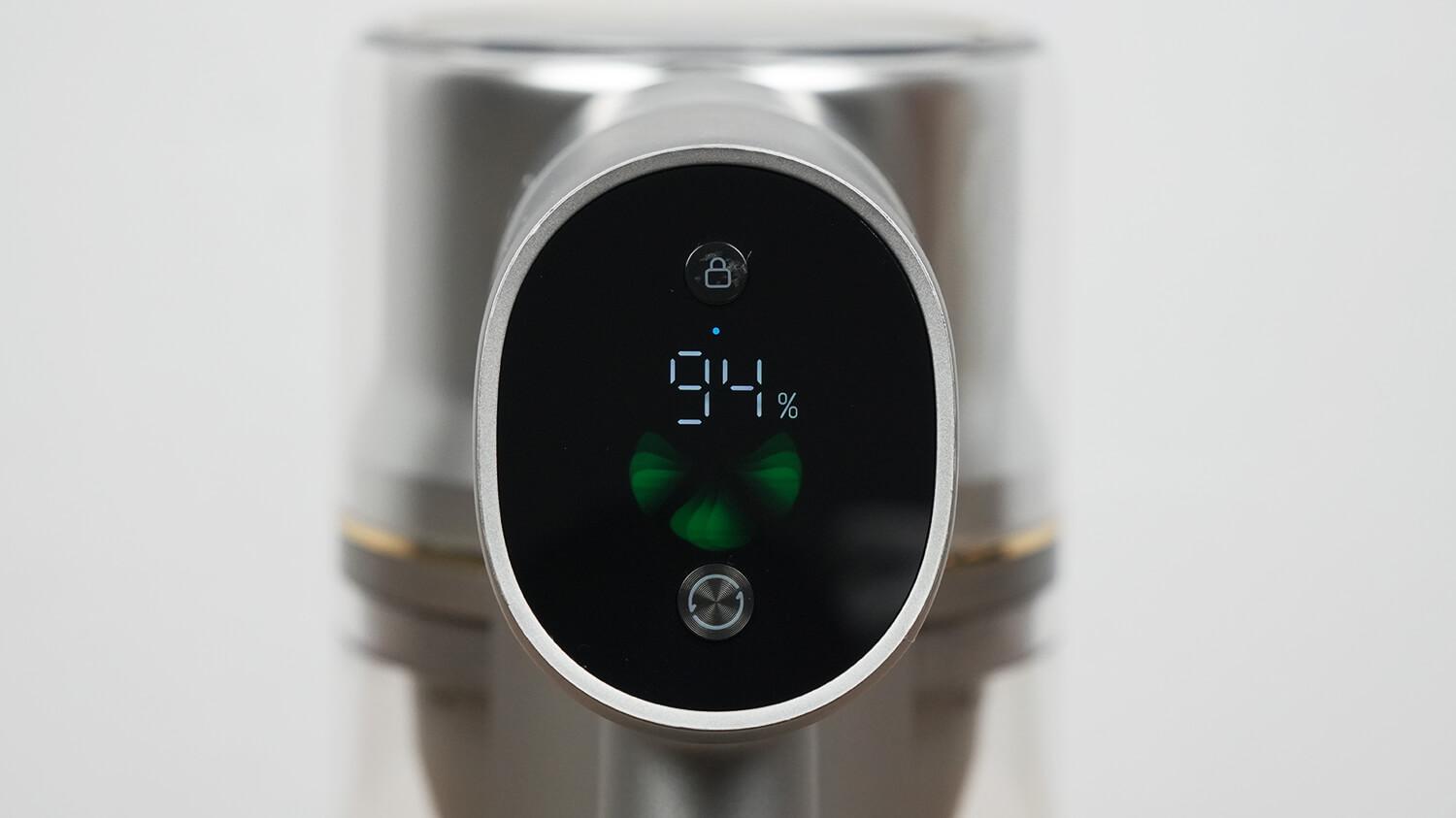 Включается и выключается пылесос нажатием на кнопку-курок. С торца размещен информативный дисплей с двумя механическими кнопками управления.