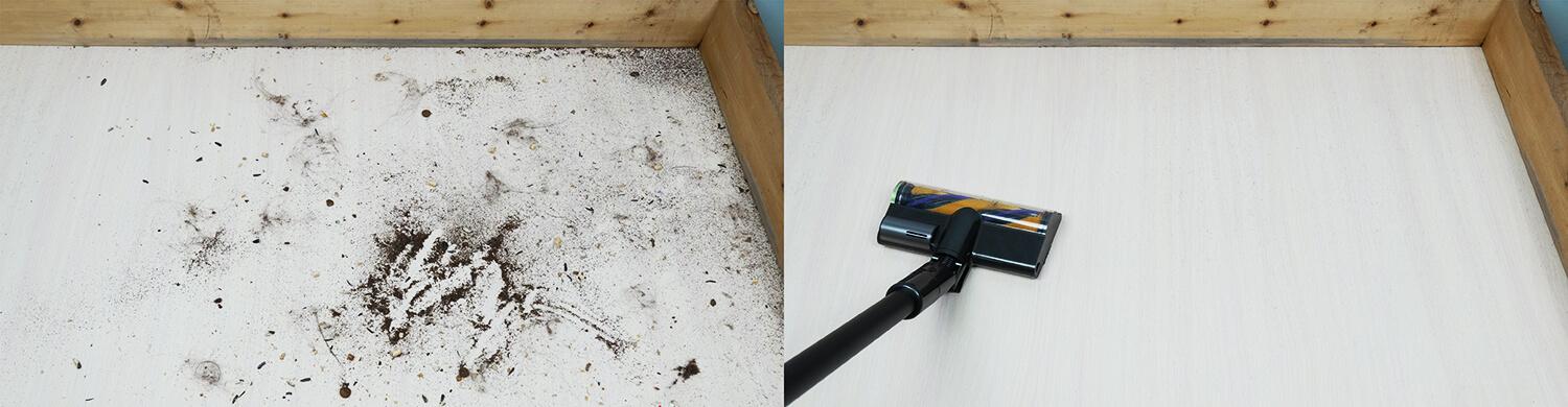 Что касается мощности, пылесос в Автоматическом режиме режиме смог вычистить мусор из 10 мм щели на простейшем стенде, а также ему без проблем удалось вычистить мусор из щелей глубиной до 20 мм на втором стенде и до 35 мм на самом сложном стенде. Так что это, безусловно, мощный вертикальный пылесос.
