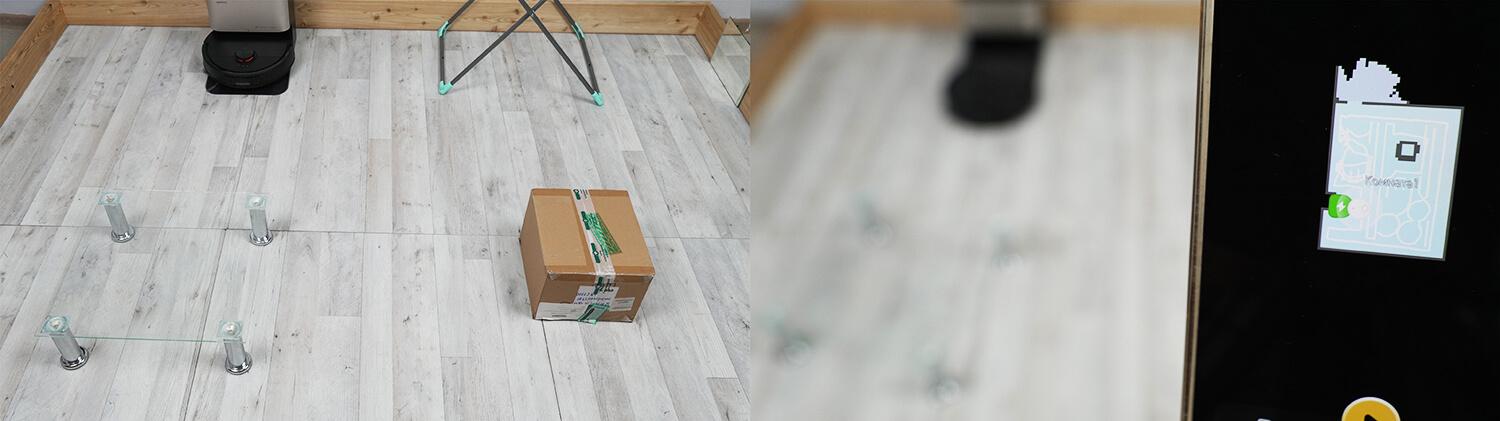 Ну и наконец-то переходим к тестам. Первым делом проверим навигацию Deerma DEM-X70 в комнате с препятствиями. После выезда со станции робот начинает обход периметра. Ножки сушилки для белья доставили ему проблем, но всё же он смог выбраться из ловушки. Отдельно пытался обмести вокруг ножек столика, но сильно толкал их из-за отсутствия датчика стены и зеркального покрытия ножек. Вокруг коробки обмел. Зеркало внесло погрешность в построение карты, но это проблема большинства лидарных роботов. В общем, есть нюансы, но ничего критичного.
