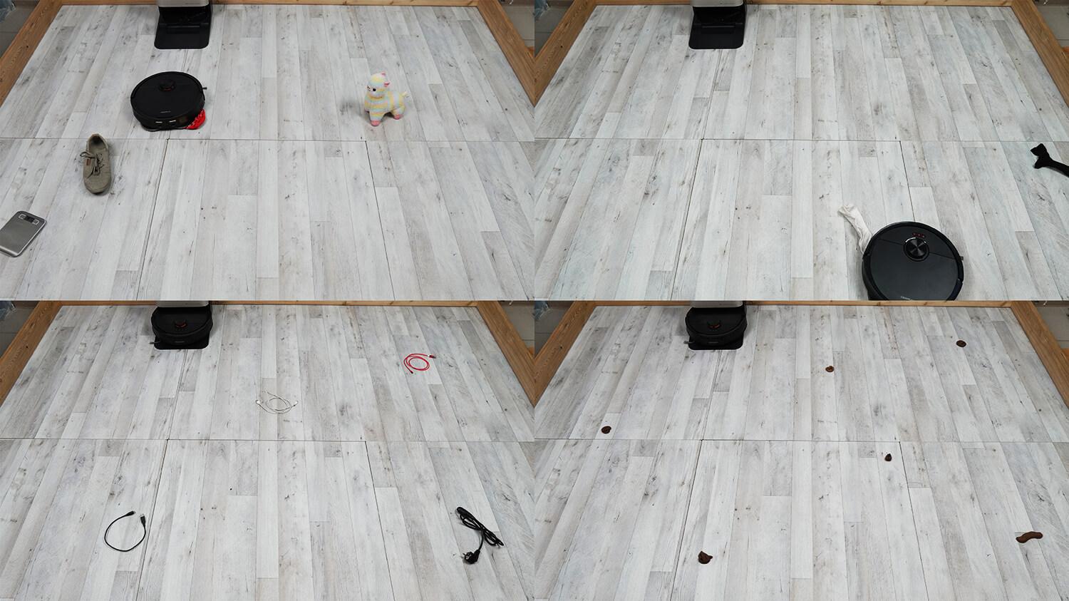 Отдельно проверил систему определения предметов на бампере, именуемую AI Action. Так вот робот сначала объехал периметр, потом приступил к уборке доступной площади змейкой. При передвижении сдвинул игрушку, переехал через имитацию сюрприза домашнего животного, сдвинут обувь, зажевал провод, заехал на весы и сдвинул носок. В общем, все 6 предметов он не определил и не объехал.