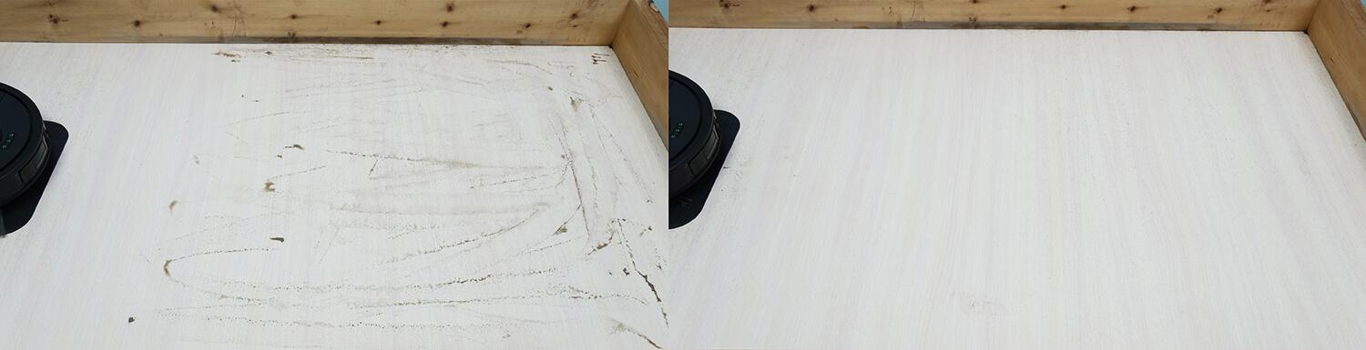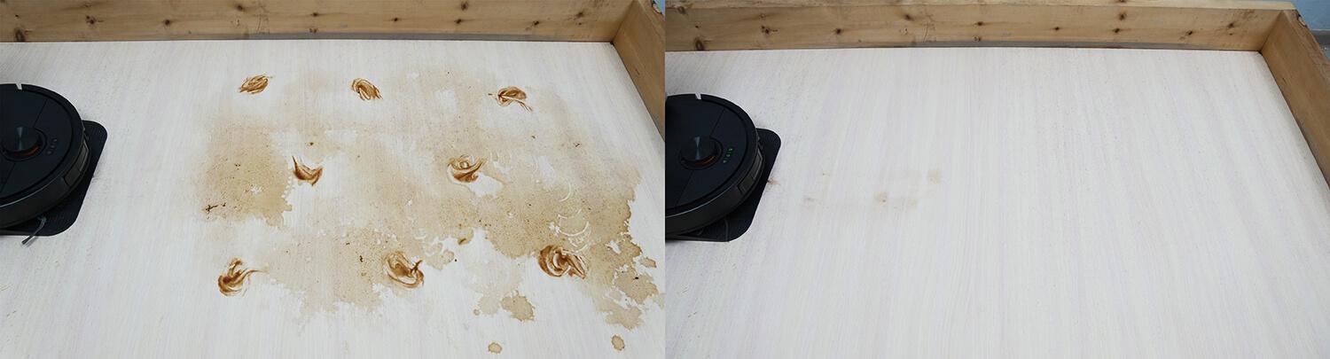 Что касается оттирания сложных загрязнений, робот смог оттереть даже засохшие пятна кофе и соуса. Да, не с первого раза. Если быть точным – основная часть пятен была удалена с 5 раза. На шестой раз он полностью справился с заданием и это отличный результат. Безусловно, Y-образная траектория движения повысила эффективность оттирания пятен. Правда видим, что при возвращении на станции остаются небольшие следы, вероятно пол пачкает турбощётка, которая не поднимается при мойке пола.