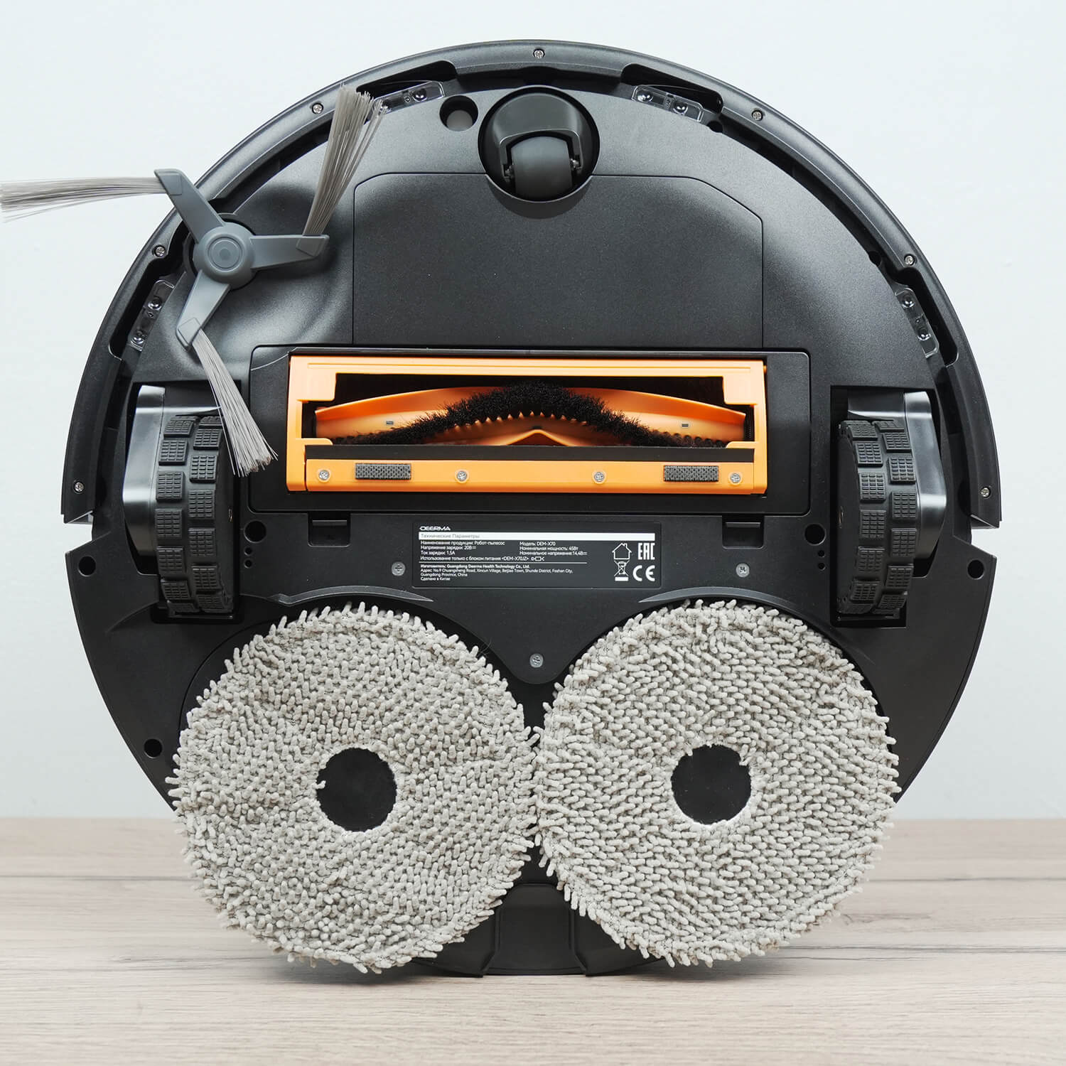 Моет пол робот двумя круглыми вращающимися салфетками. Они привычного исполнения, закреплены на держателях с помощью липучек. За правым держателем установлен механизм для выезда салфетки вплотную к плинтусам и мебели. Также стоит заметить, что салфетки автоматически поднимаются при заезде на ковры. Ещё заметил, что робот сдает назад в углах, что позволяет салфеткам заходить лучше в углы, это плюс.