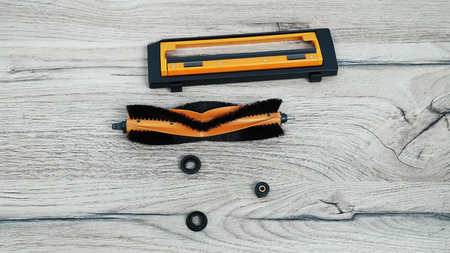 Блок центральной щётки не плавающий, но реализовали подвижный скребок. Центральная щётка щетинисто-лепестковая, с двух сторон разбирается для очистки от намотанных волос и шерсти.