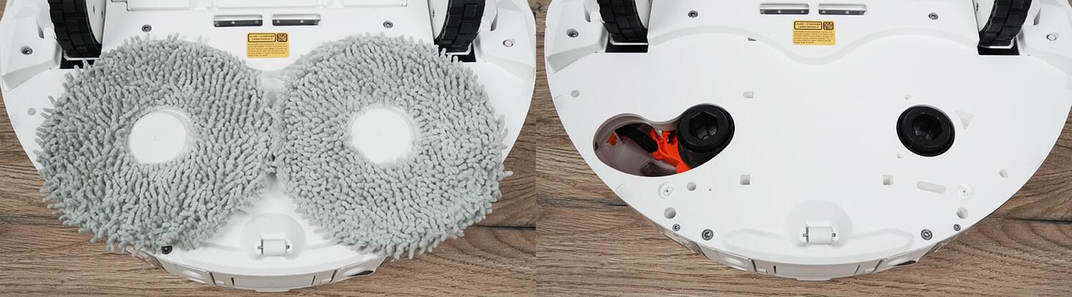 За одним из держателей видим механизм выезда салфетки к краю для тщательной мойки пола вдоль плинтуса и в углах. Обе салфетки автоматически поднимаются вверх при заезде на ковры, в режиме сухой уборки и при возврате робота на станцию.