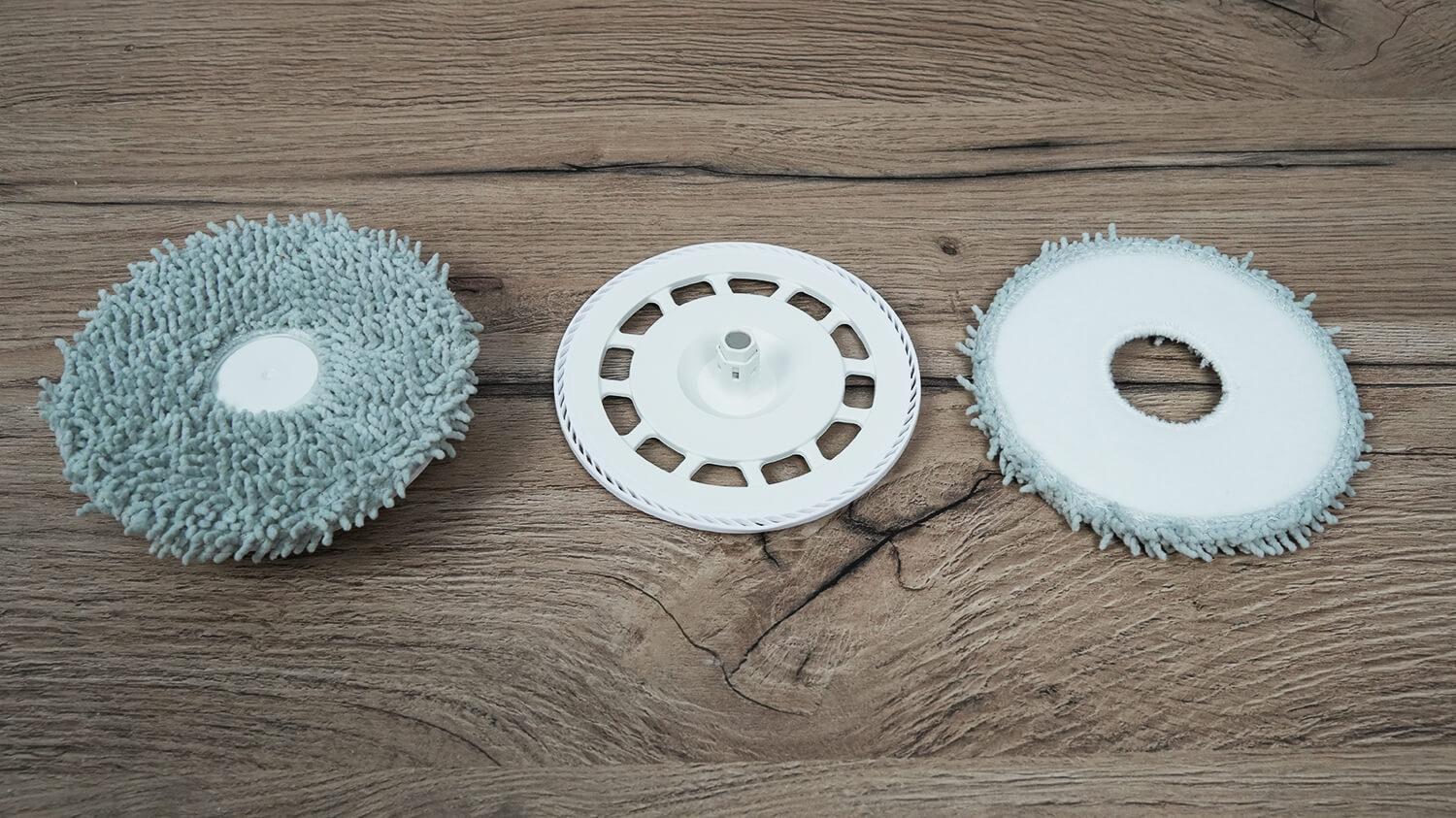 Мойка пола осуществляется двумя круглыми вращающимися салфетками, которые закреплены на держателях с помощью липучек. Салфетки очень плотные, хорошего качества.