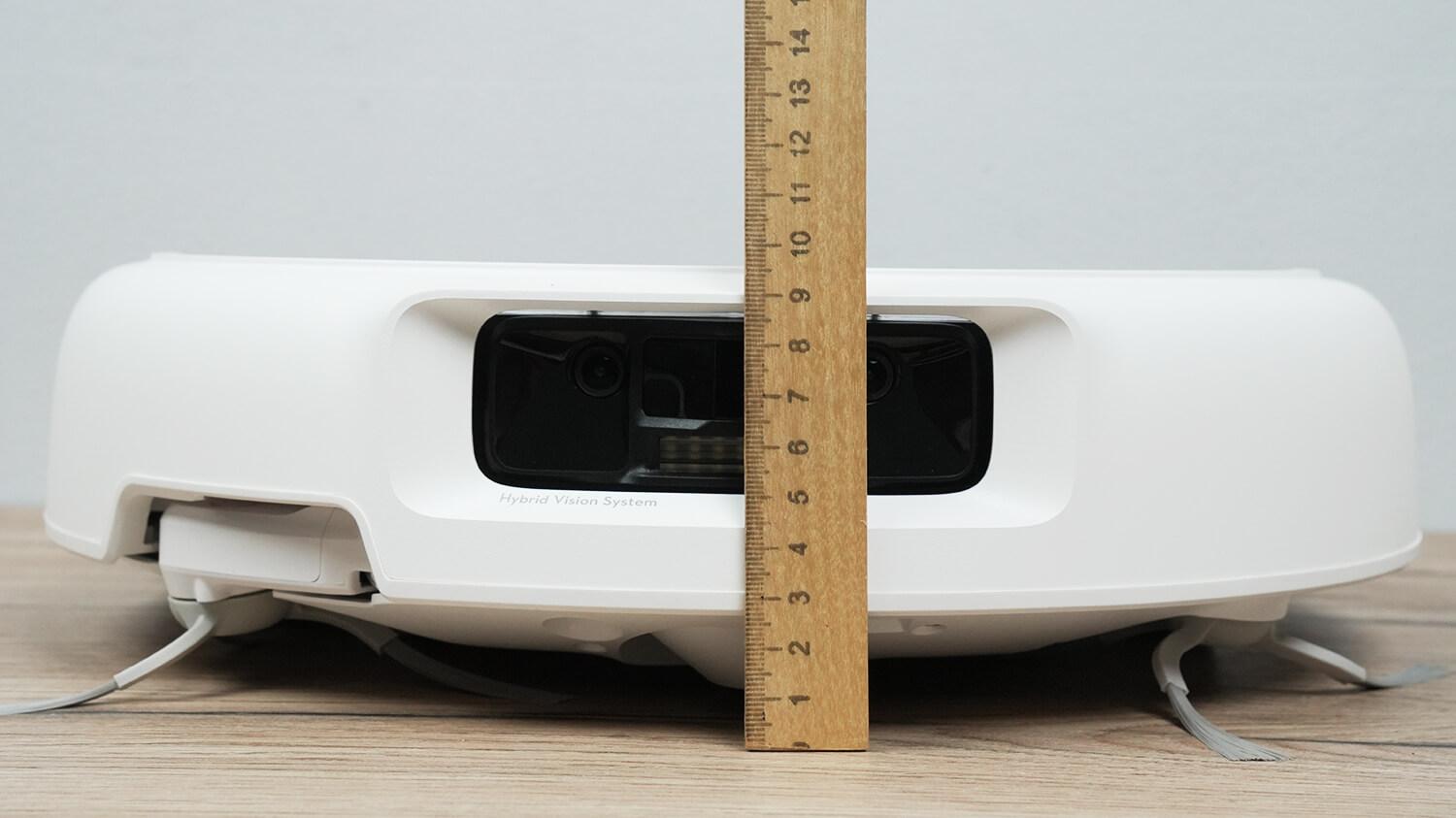 Привычного лидара-башни сверху на корпусе нет. С двух сторон на бампере установлены датчики стены. По центру размещена система навигации робота, состоящая их датчиков и камер с подсветкой.