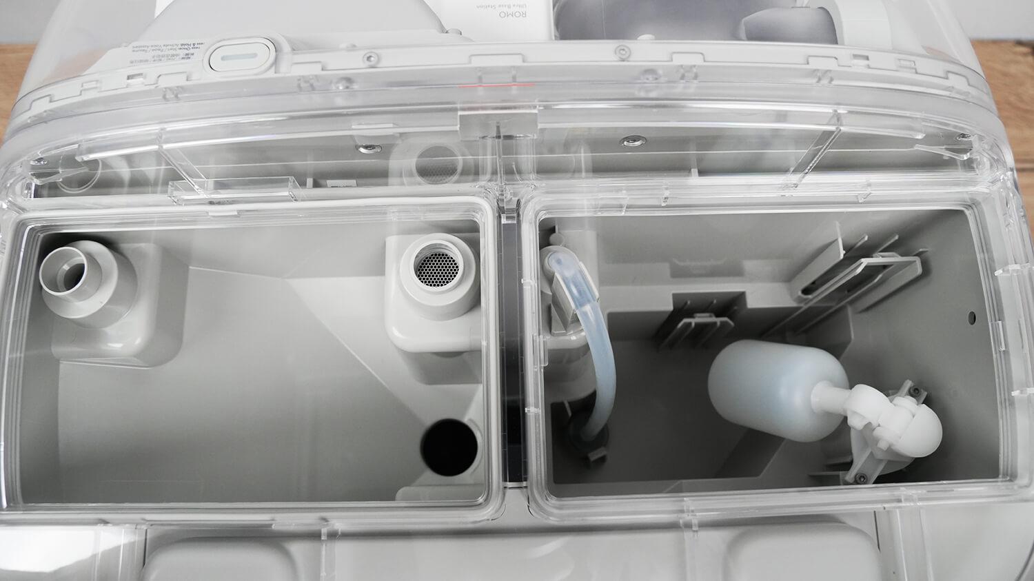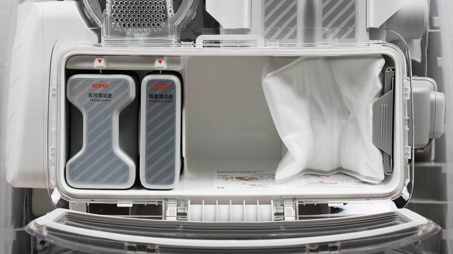 Над парковкой робота под крышкой размещен мешок для мусора и два резервуара для моющего средства. Мешок привычного исполнения, объемом 2,4 литра. Емкость объемом 400 мл – это обычное моющее средство, которое будет автоматически подмешиваться к чистой воде при стирке салфеток. Но есть ещё и отдельная емкость с дезинфицирующим средством, объемом 200 мл. В настройках можно выбрать, какое моющее средство использовать.