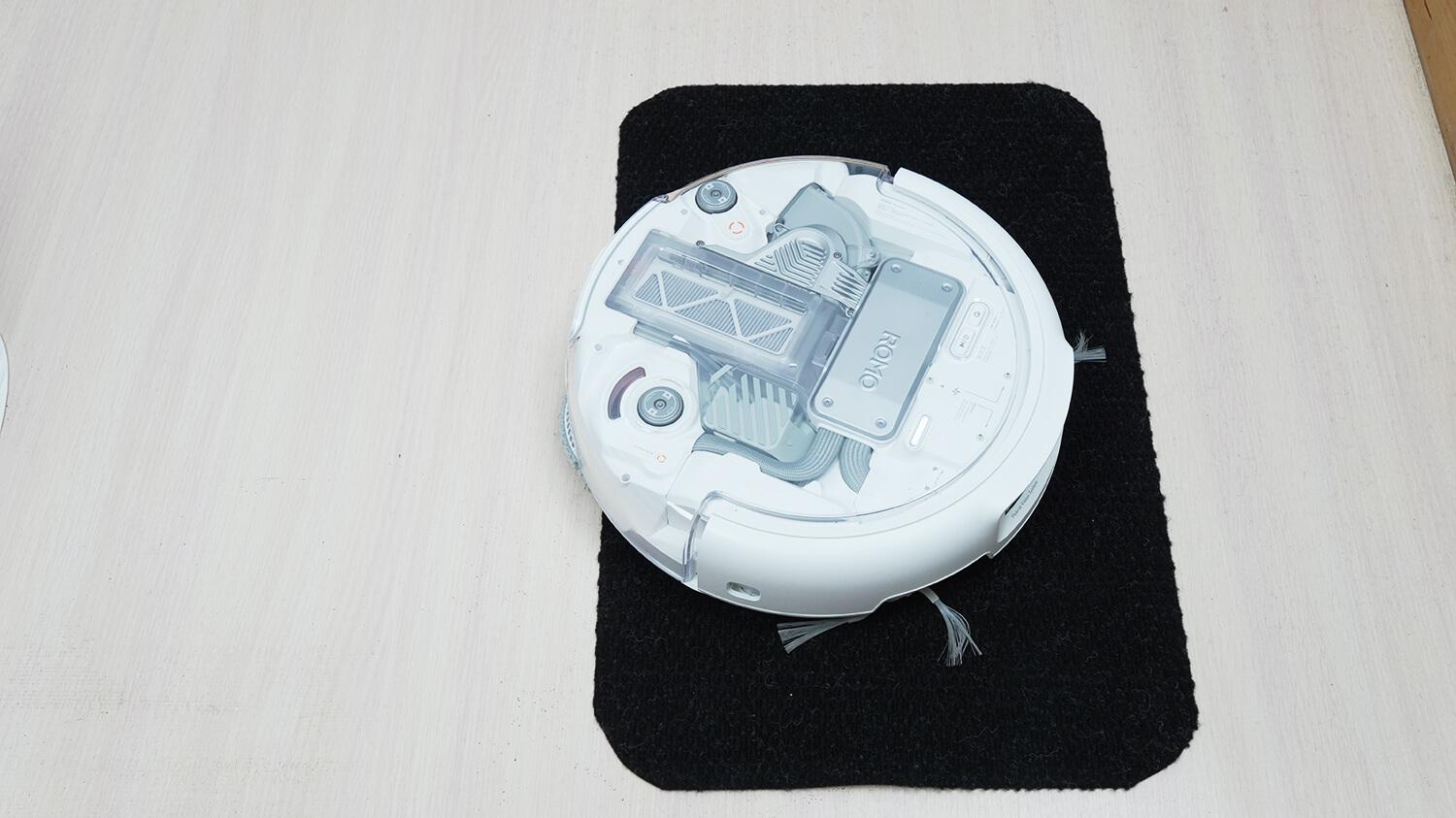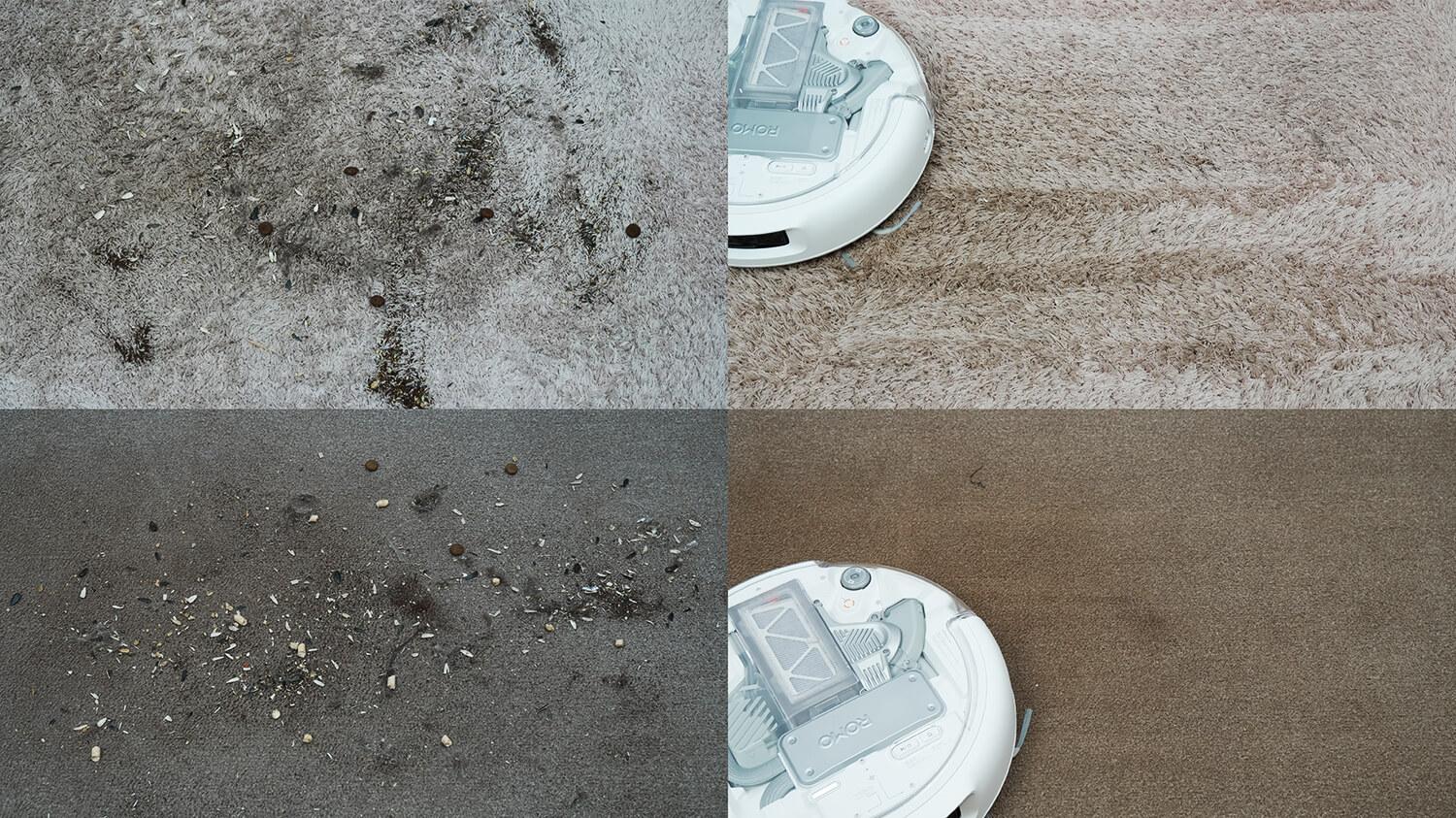 Проверил качество чистки ковров. И могу сказать, что DJI ROMO P тщательно вычистил ковровое покрытие с низким ворсом. Ковер со средним ворсом он также способен тщательно вычищать. Но всё же крупные частицы мусора с трудом захватываются силиконовой щёткой. В этом плане щетинисто-лепестковая щётка лучше справляется с задачей.