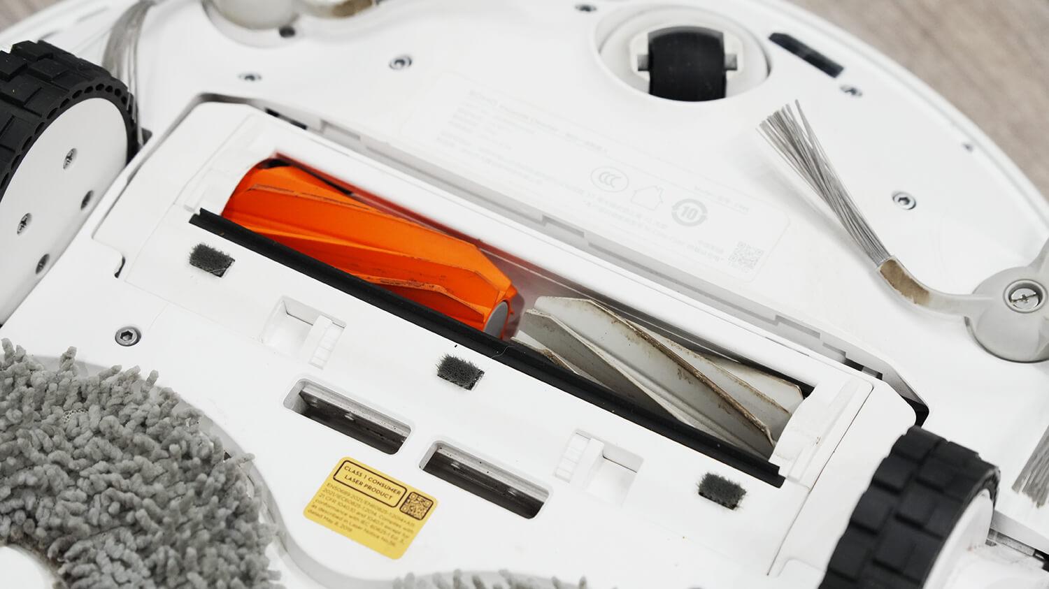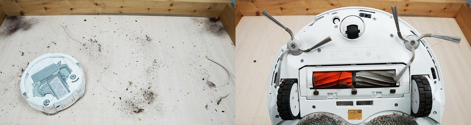 Посмотрите на состояние чистящего модуля. Видите, что центральная щётка немного намотала волос, как и боковые щётки. Но не критично, учитывая количество мусора на стенде. Нужны дополнительные тесты!