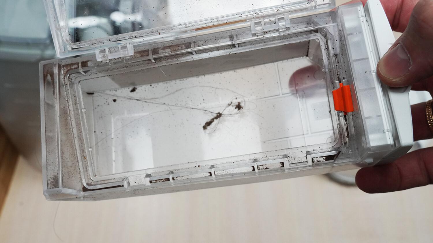 Сразу же после «грязных тестов» проверил, насколько хорошо самоочищается робот-пылесос. Вернул его на станцию и запустил самоочистку. Результат не идеальный, но считаю, что хороший. Возможно, когда извлекал пылесборник и ставил обратно, зажал эту волосинку.