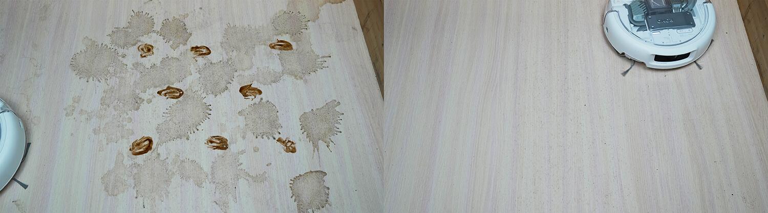 Что касается оттирания сложных загрязнений, робот смог оттереть даже засохшие пятна кофе и соуса. И самое интересное, что на оттирание основной части пятен потребовалось всего 4 прохода, за 5 проход он полностью отмыл минимальные остатки соуса на стенде, тогда как отличным считается результат в 5-6 проходов.