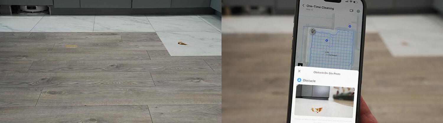 Что касается системы объезда предметов, она очень хорошо реализована. При хорошем освещении DJI ROMO P смог определить и аккуратно объехать все 6 из 6 бытовых предметов, 3 из 3 носков, 4 из 4 проводов и 6 из 6 имитаций сюрпризов домашних животных. Нюанс лишь в том, что система датчиков и камер определяет предметы на полу, но не распознает, что конкретно лежит. Вероятно, доработают этот нюанс обновлением прошивки, тем не менее пока что распознавание объектов подтвердить не могу.