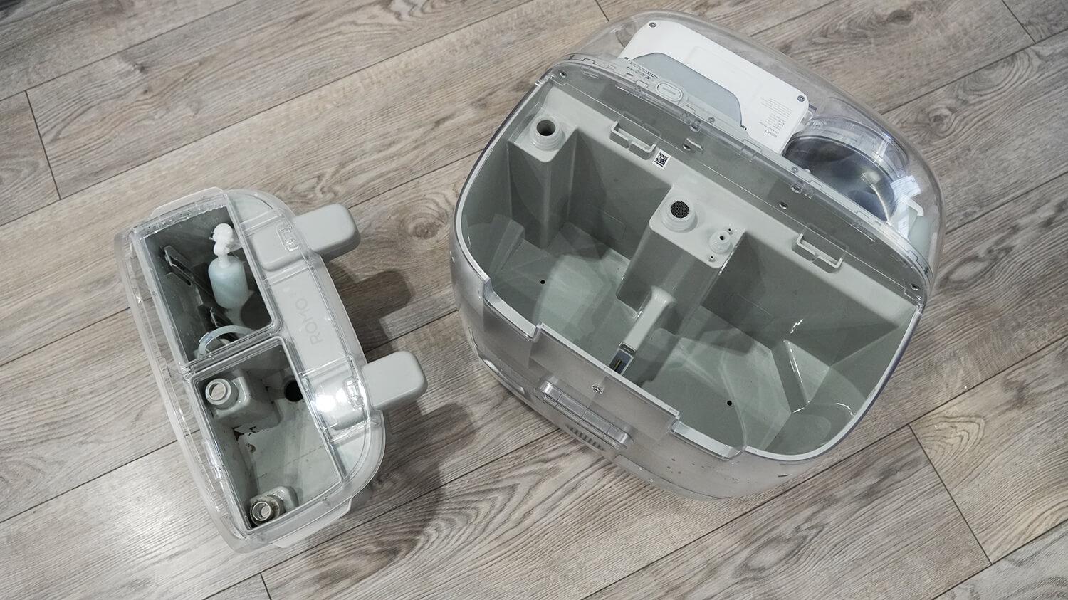 Бак для воды несъемный, но его видно через прозрачный корпус. Объема бака 164 мл, что вдвое больше, чем у премиальных аналогов. Вода закачивается автоматически через станцию.