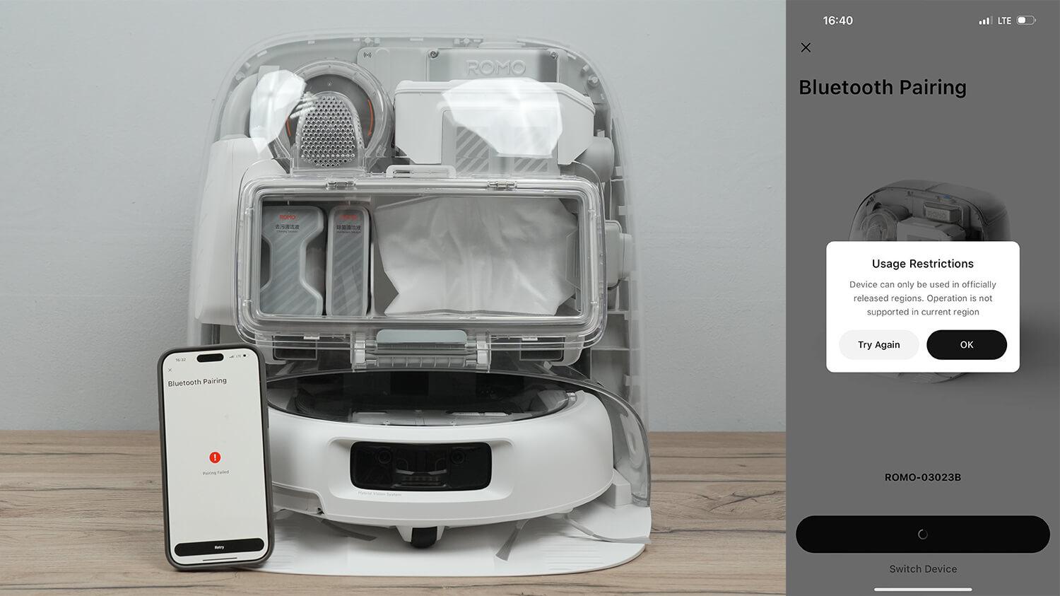 Начнем с самого неприятного. На момент подготовки обзора DJI ROMO P – это версия, предназначенная для китайского рынка. За пределами Китая при подключении к приложению появляется уведомление о несоответствии региона модели. Подключить робот к сети и зайти в меню не получится. Существуют способы обойти региональную блокировку, но рассказывать о них запрещено законом, поэтому тут рекомендуют изучить информацию на форумах, как это сделал я. Отдельное спасибо Артему Белику за помощь в подключении робота.