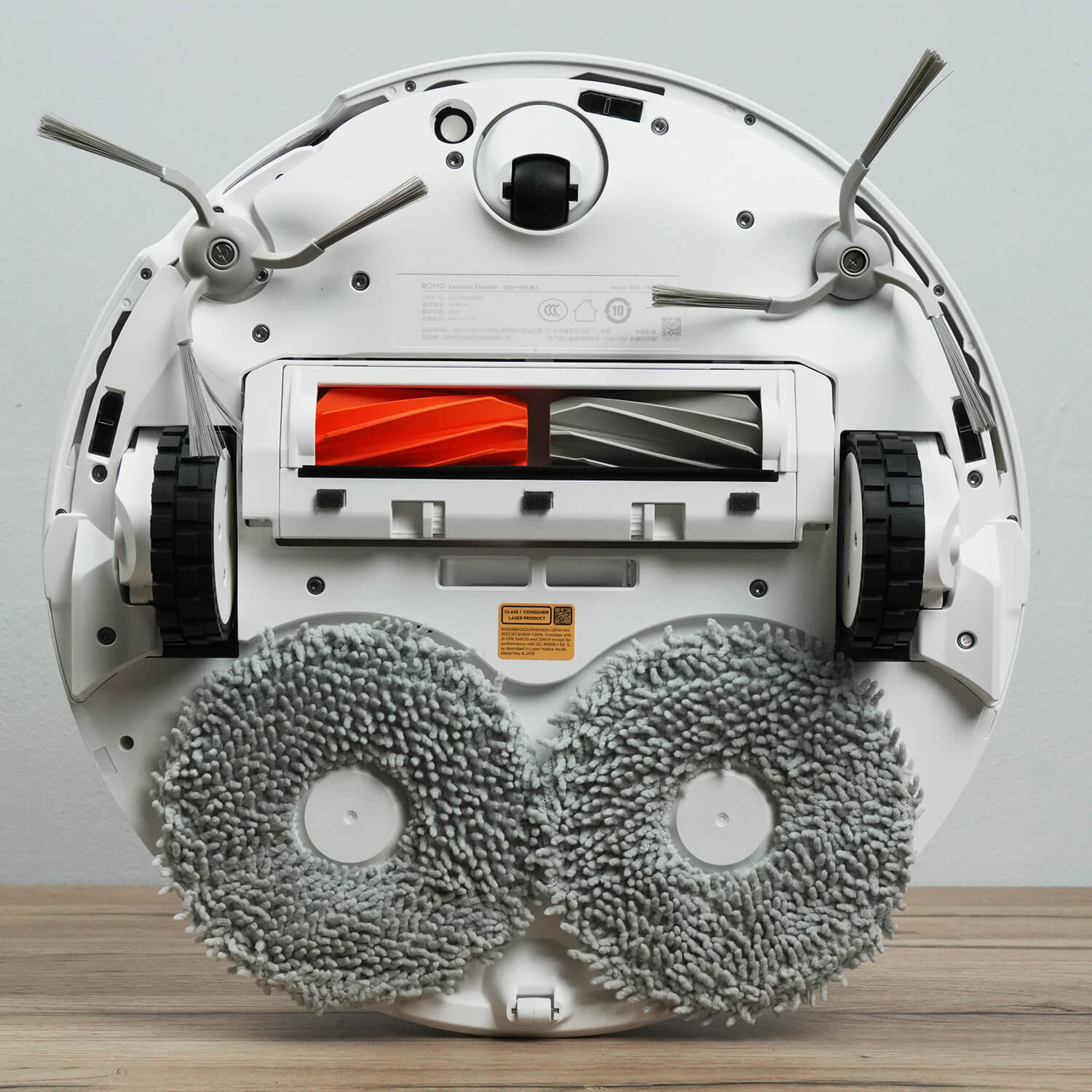 Снизу на роботе установлено на удивление всего 3 датчика защиты от падения. Есть и датчик ковра. Боковых щёток две, обе трехлучевые, закреплены винтами. Одна из боковых щёток выезжает в углах для выметания мусора.