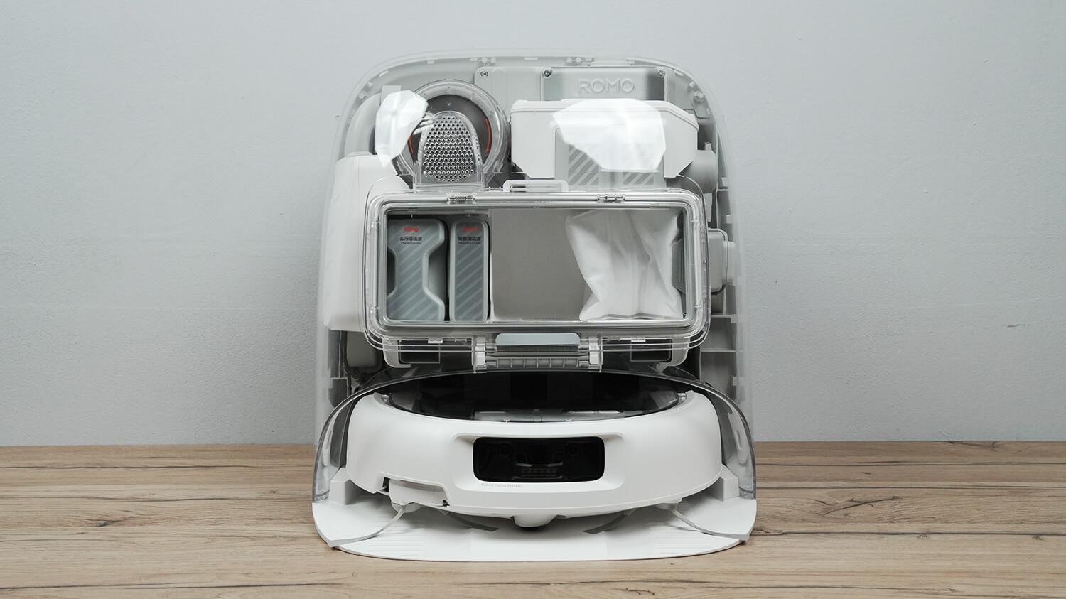 - Максимально заряженная по меркам 2025 года станция формата «Всё в одном». Есть и стирка салфеток теплой водой, и сушка теплым воздухом, и самоочистка пылесборника, и автоподмешивание моющего средства из двух ёмкостей, и даже УФ-лампа для обеззараживания мусора.