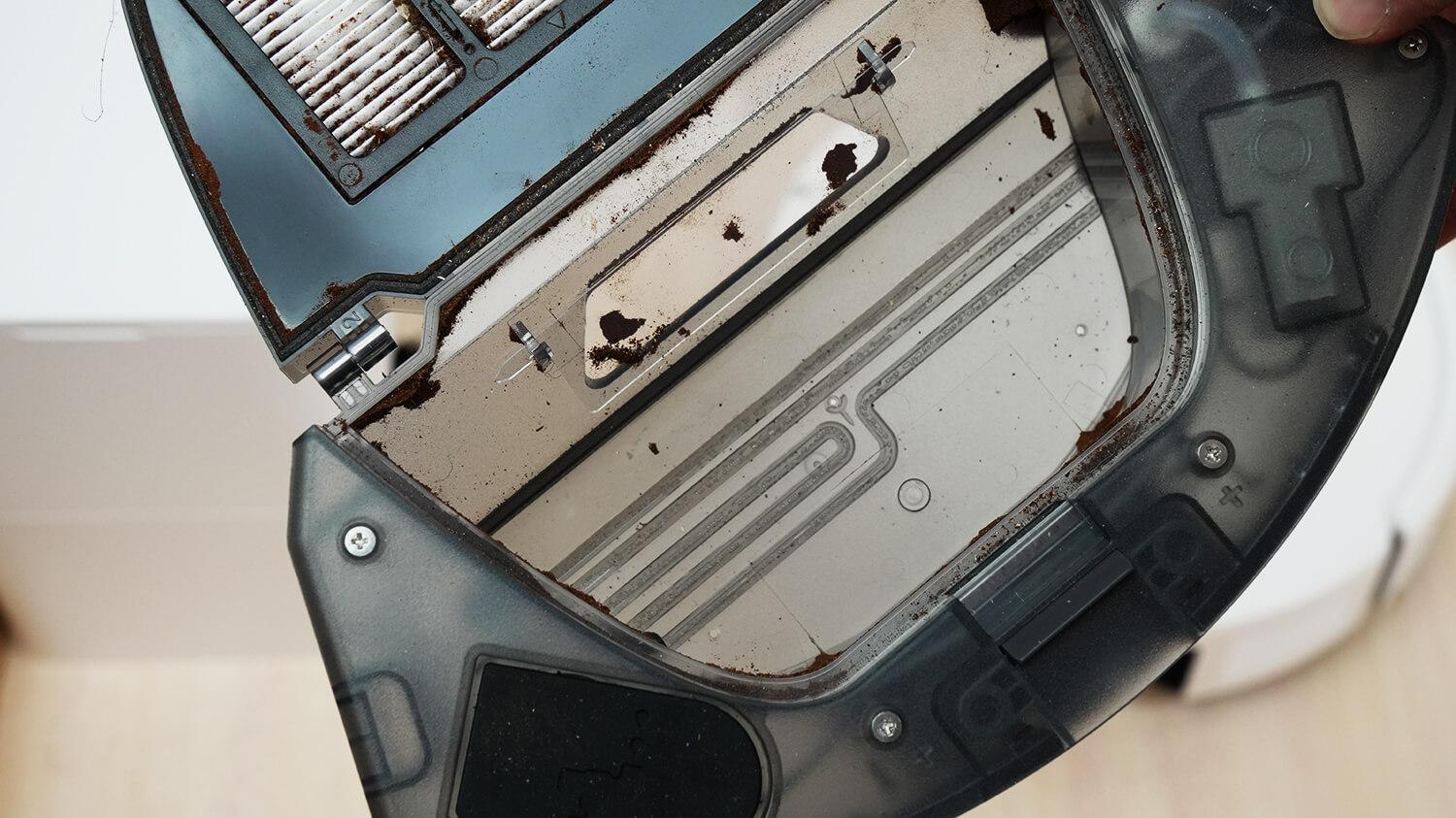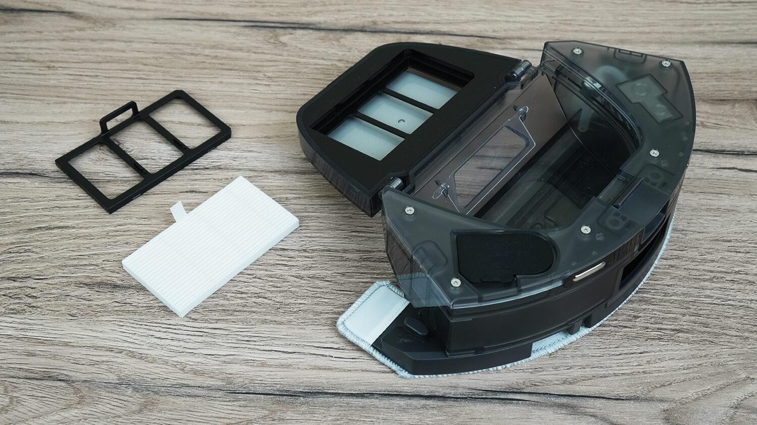 Пылесборник объемом 330 мл. Внутри установлен только HEPA-фильтр. Бак для воды объемом 245 мл. В нём установлен насос для электронной регулировки подачи жидкости. Сзади расположены клеммы для зарядки и канал со шторкой для выгрузки мусора из пылесборника в мешок в станции.