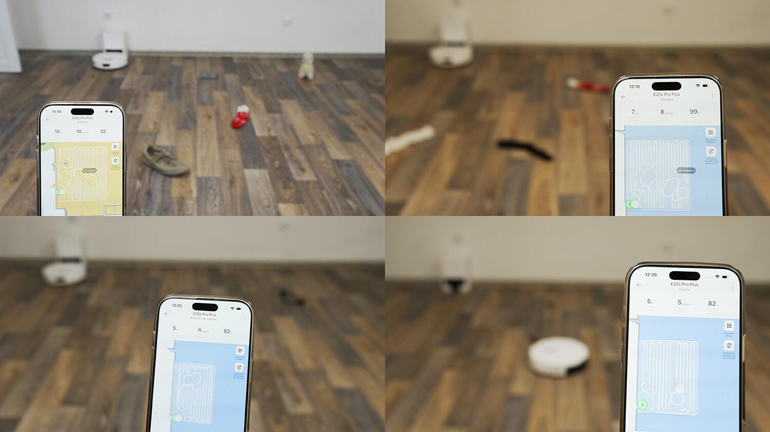 Отдельно проверил систему определения предметов на бампере. Так вот при хорошем освещении TROUVER E20s Pro Plus смог объехать только 4 крупных предмета: весы, игрушку, обувь и даже носок. Провод и имитацию сюрприза домашнего животного робот зажевал. Из 3 носков 2 аккуратно объехал, а один зацепил и протянул по полу, но не зажевал и не ушел в ошибку. Из 4 проводов смог объехать только большой черный, остальные 3 зажевал. Ну и из 6 ловушек в виде имитаций сюрпризов домашних животных робот переехал все 6, причем одна из имитаций заблокировала щётку, и он ушел в ошибку.