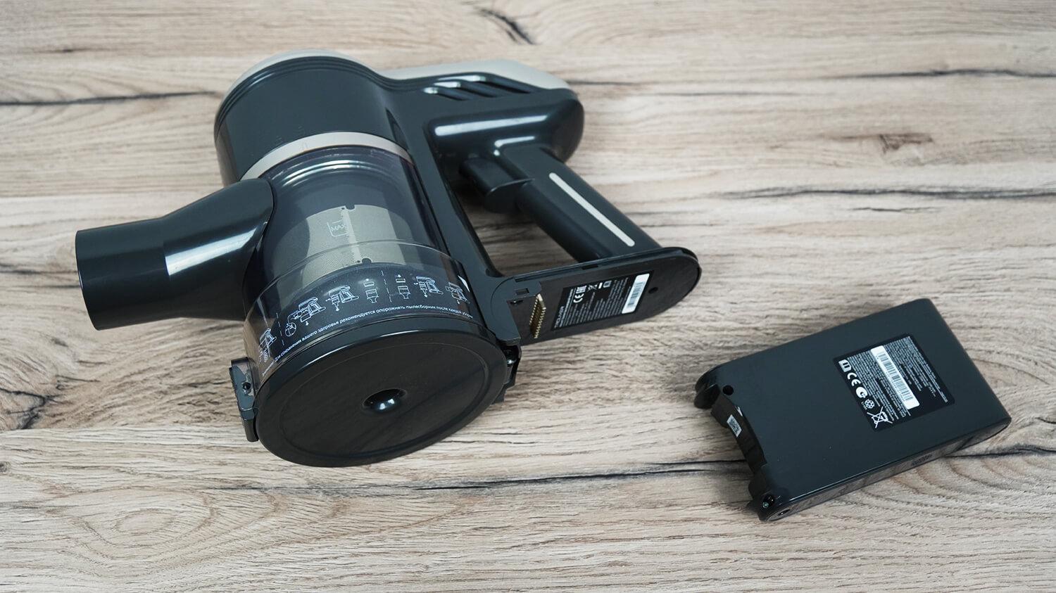 Теперь рассмотрим, как устроен Trouver J40. Внутри основного блока установлен 460-ваттный двигатель, развивающий силу всасывания до 150 Аэроватт или же до 28 000 Па. Аккумулятор съемный, это плюс. На нём размещен разъем для подключения зарядного устройства.