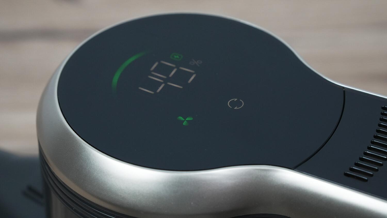 Включается и выключается пылесос нажатием на кнопку, расположенную под большой палец. Сверху видим информативный дисплей с сенсорной кнопкой переключения режимов мощности. Их три: минимальный, средний и максимальный.