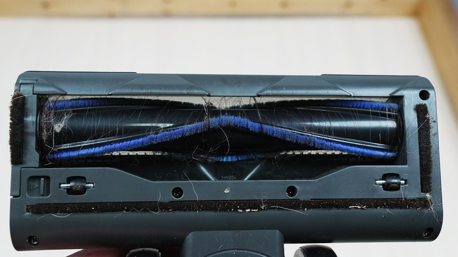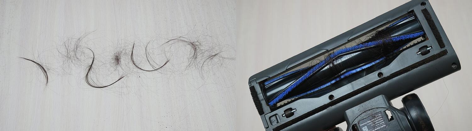 Отдельно проверил, как справляются гребни с распутыванием роллера от волос. Разложил на полу волосы разной длины и собрал их пылесосом. Видим, что на роллер намотались волосы. Так что система защиты от запутывания волосами не очень эффективна. Но в принципе, почистить турбощётку раз в несколько уборок вручную не составит труда.