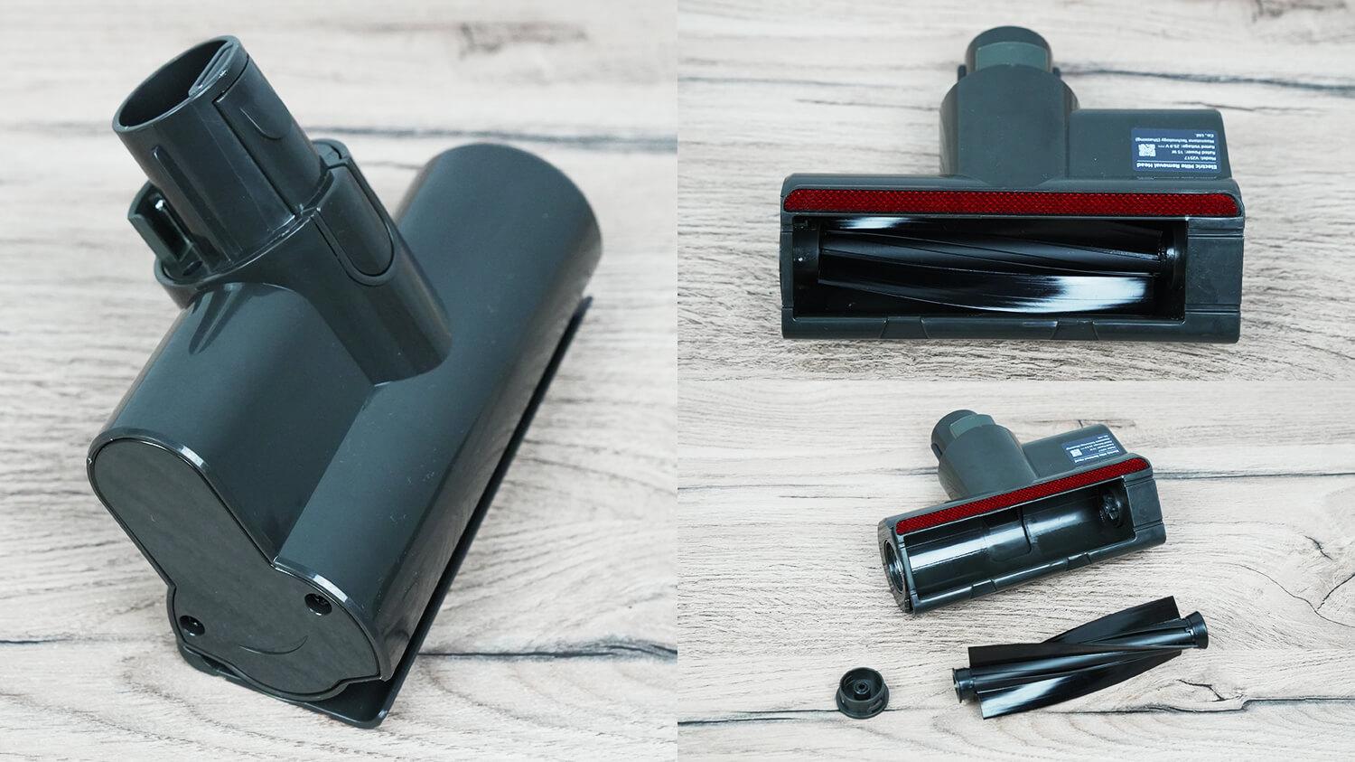 Основная насадка для пола оснащена поворотным шарниром и подсветкой убираемой зоны спереди. Видим технологические просветы для прохождения крупного мусора. Роллер легко извлекается из насадки без дополнительного инструмента.