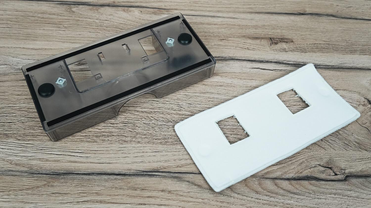 К основной насадке можно пристегнуть насадку для влажной уборки. Это резервуар для воды, снизу на который пристегнута салфетка из микрофибры. Объем бака 300 мл. Салфетка удерживается на липучках. Вода поступает на салфетку самотёком через клапаны-дозаторы.