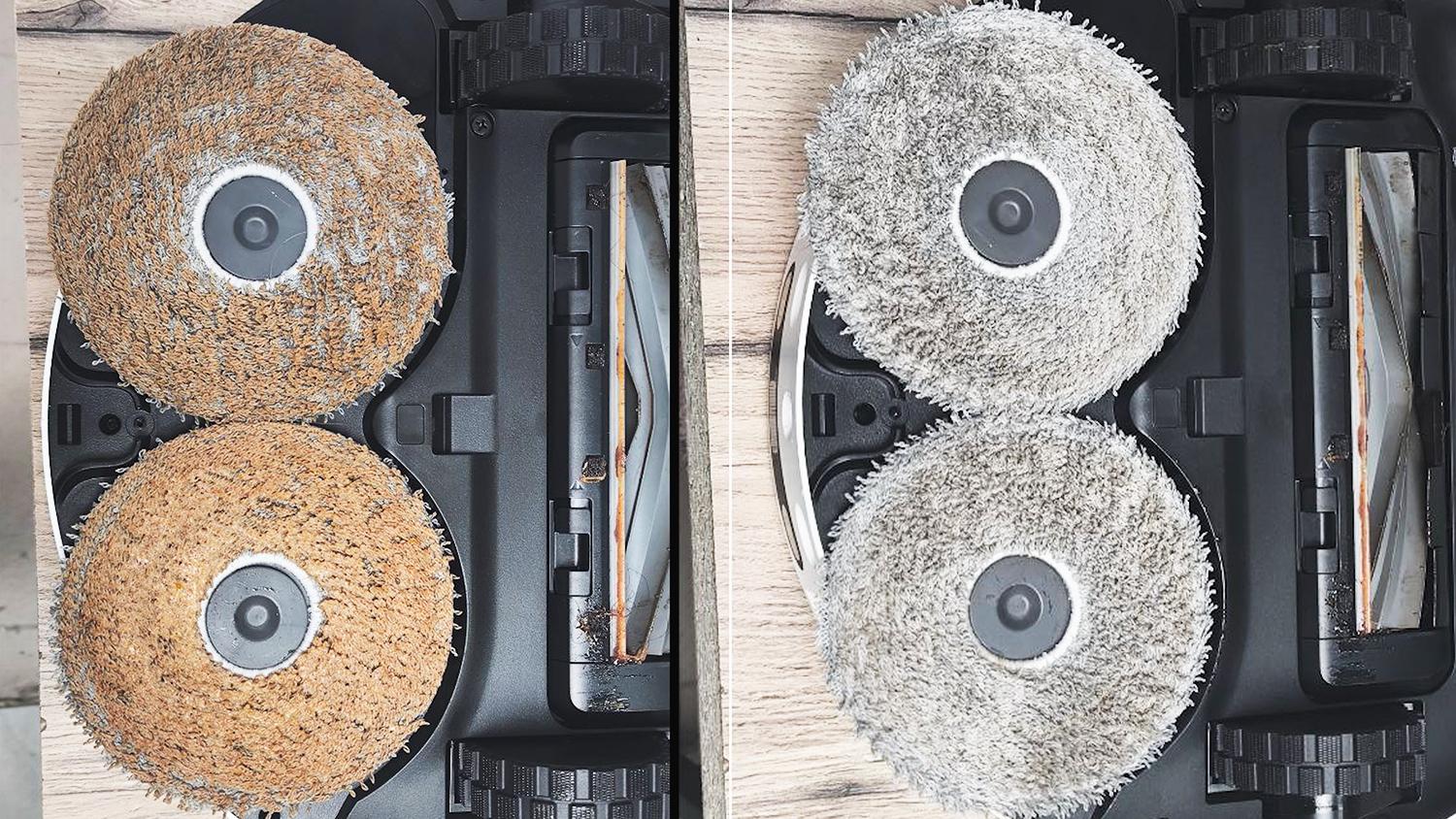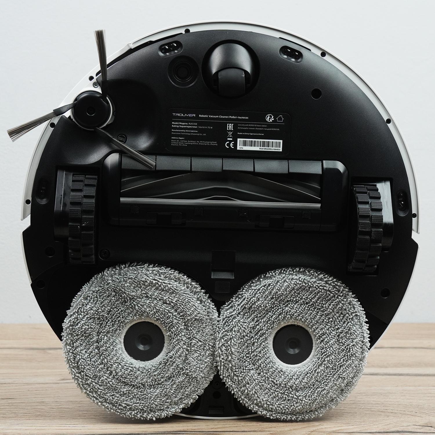 Что касается влажной уборки, робот моет пол двумя круглыми вращающимися салфетками. Они привычного исполнения, удерживаются на липучках. Одна из салфеток выезжает к краю корпуса для тщательной мойки пола вдоль стен и мебели. Предусмотрен даже алгоритм прокручивания задней частью в просветах под мебелью. Кроме этого, робот заезжает задней частью в углы, чтобы также минимизировать слепые зоны.