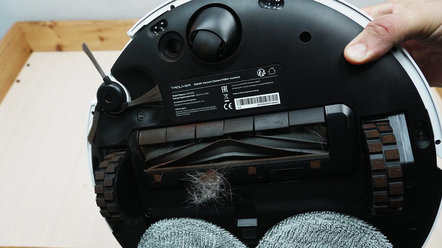Ну и вот состояние чистящего модуля после сбора мусора. Видим, что боковая щётка чистая, а центральная намотала на себя немного волос.