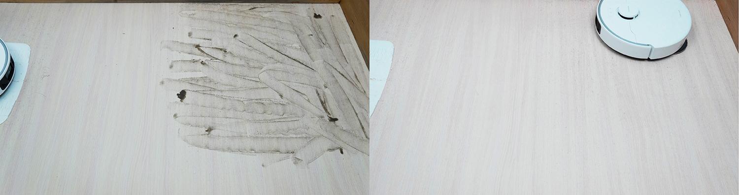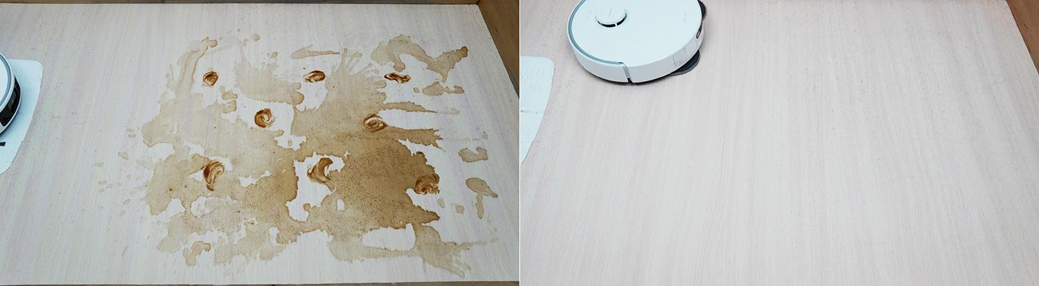 Что касается оттирания сложных загрязнений, робот смог оттереть даже засохшие пятна кофе и соуса. Да, не с первого раза. Если быть точным – основная часть пятен была удалена с 5 раза. Причем это без моющего средства, т.к. в комплекте его не было. Для сравнения, старший P50 Pro Ultra оттер основную часть пятен за 6 раз с моющим средством. Думаю, дело случая, но как ни крути, робот хорошо справляется с оттиранием пятен. Результат лучше, чем у многих аналогов.
