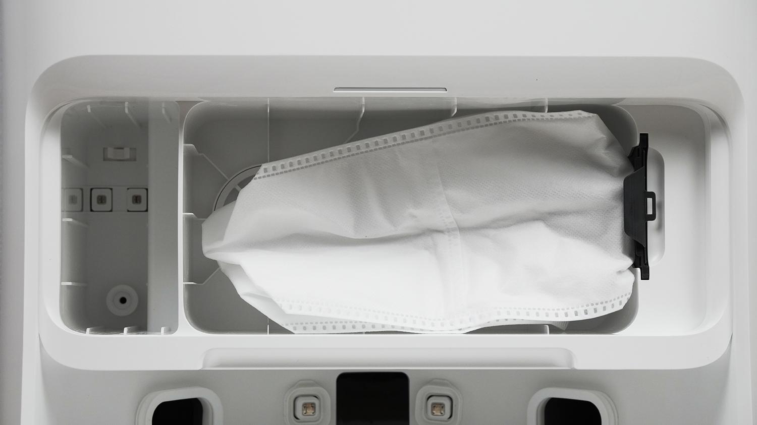 Сравнивая с возможностями станции P50 Pro Ultra, тут, судя по всему, отсутствуют датчики контроля степени загрязнения салфеток для повторной их промывки при необходимости. Также отсутствует бак для автоподмешивания моющего средства, хотя посадочное место под него есть. Вероятно, сам бак можно докупить отдельно и установить. Мешок для мусора привычного исполнения, вмещает до 3,2 литра сухого мусора.