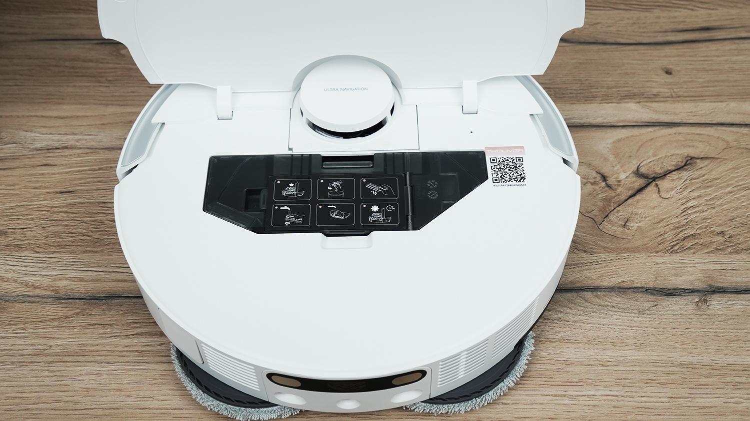 Пылесборник объемом 300 мл размещен под верхней крышкой. Рядом с контейнером есть наклейка с QR-кодом для подключения робота к Wi-Fi сети.
