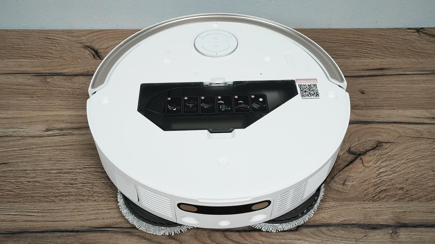 Пылесборник объемом 300 мл размещен под верхней крышкой, которая удерживается на магнитах. Рядом видим QR-код для подключения робота к Wi-Fi сети.