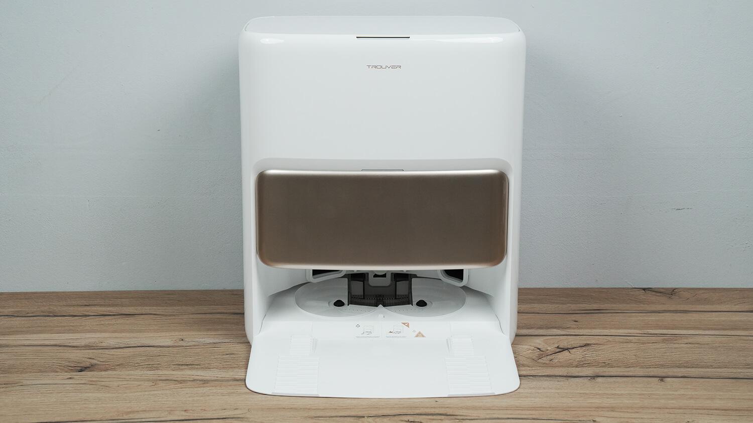 С роботом разобрались — теперь очередь станции. Здесь Trouver V50 Ultra Complete не просто подзаряжается: он самоочищает пылесборник, промывает салфетки горячей водой, автоматически подмешивая моющее средство, сушит салфетки теплым воздухом, а также сушит сам пылесборник и мешок для мусора. Плюс к этому предусмотрена УФ-стерилизация мешка и зоны стирки салфеток. Единственная проблема этой станции – её невозможно подключить к канализации и водопроводу, и это первое серьезное замечание к роботу. Теперь подробнее о каждом узле станции.