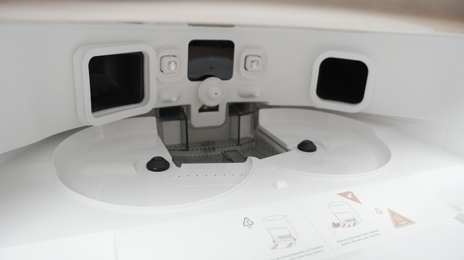 Дно станции плоское и без гребней, что упрощает обслуживание и улучшает самоочистку самого дна — грязи просто не за что цепляться. Салфетки промываются через 20 форсунок, равномерно смачивающих оба мопа. Вода при стирке нагревается до 80 °C, а сушка проходит воздухом температурой около 60 °C — салфетки выходят чистыми и полностью сухими, без запахов.