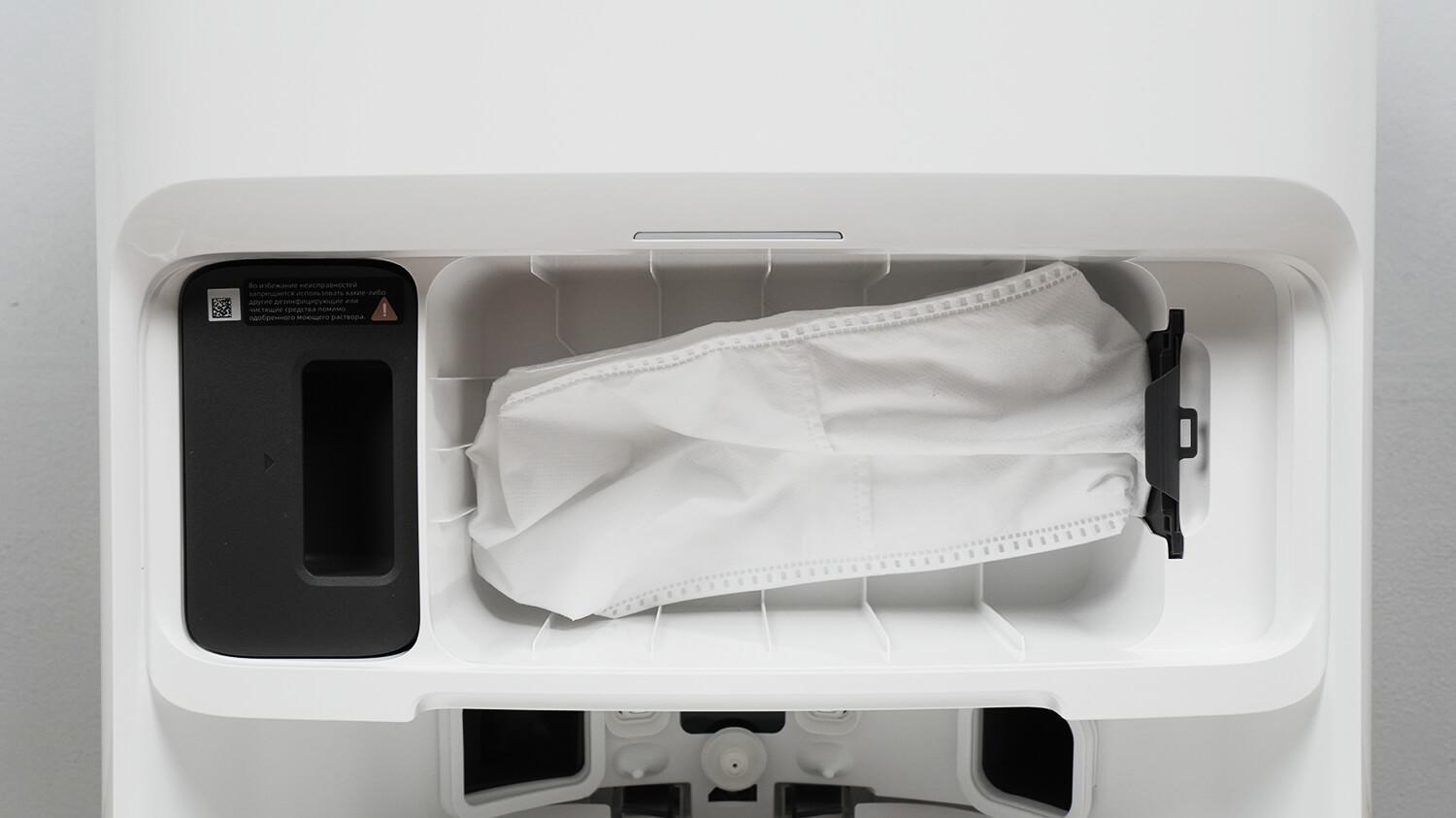 Над парковкой робота под крышкой размещен мешок для мусора и резервуар для моющего средства.
