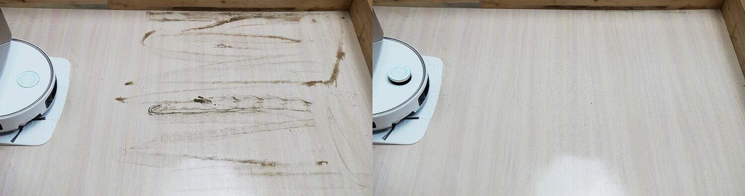 Одна из салфеток выезжает к краю корпуса для тщательной мойки пола вдоль стен и мебели. Предусмотрен даже алгоритм прокручивания задней частью в просветах под мебелью. Кроме этого, робот заезжает задней частью плотно в углы, чтобы также минимизировать слепые зоны.