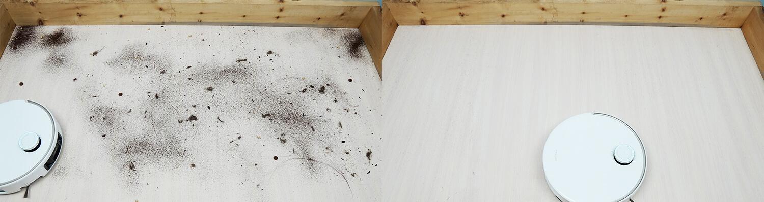Качество уборки на ламинате отличное: робот собрал весь мусор со стенда, включая тяжёлые крупные гранулы кошачьего наполнителя, которые часто застревают в турбощётках. Особенно радует уборка углов — выдвижная боковая щётка собирает мусор полностью. Внешние углы также подчищаются, хотя небольшие слепые зоны остаются вдоль края ближе к углам.