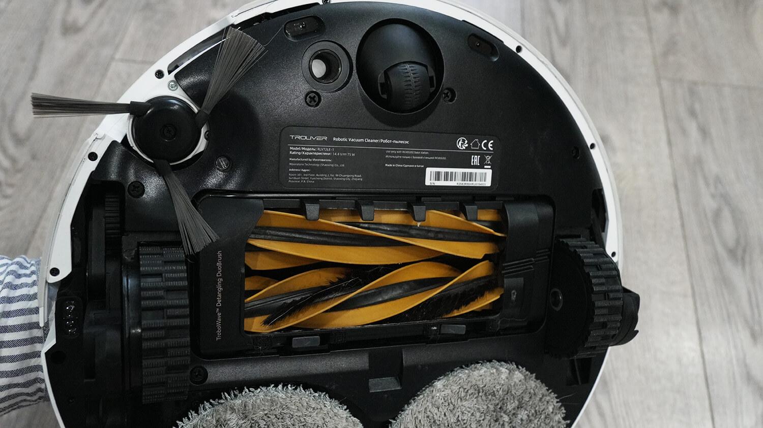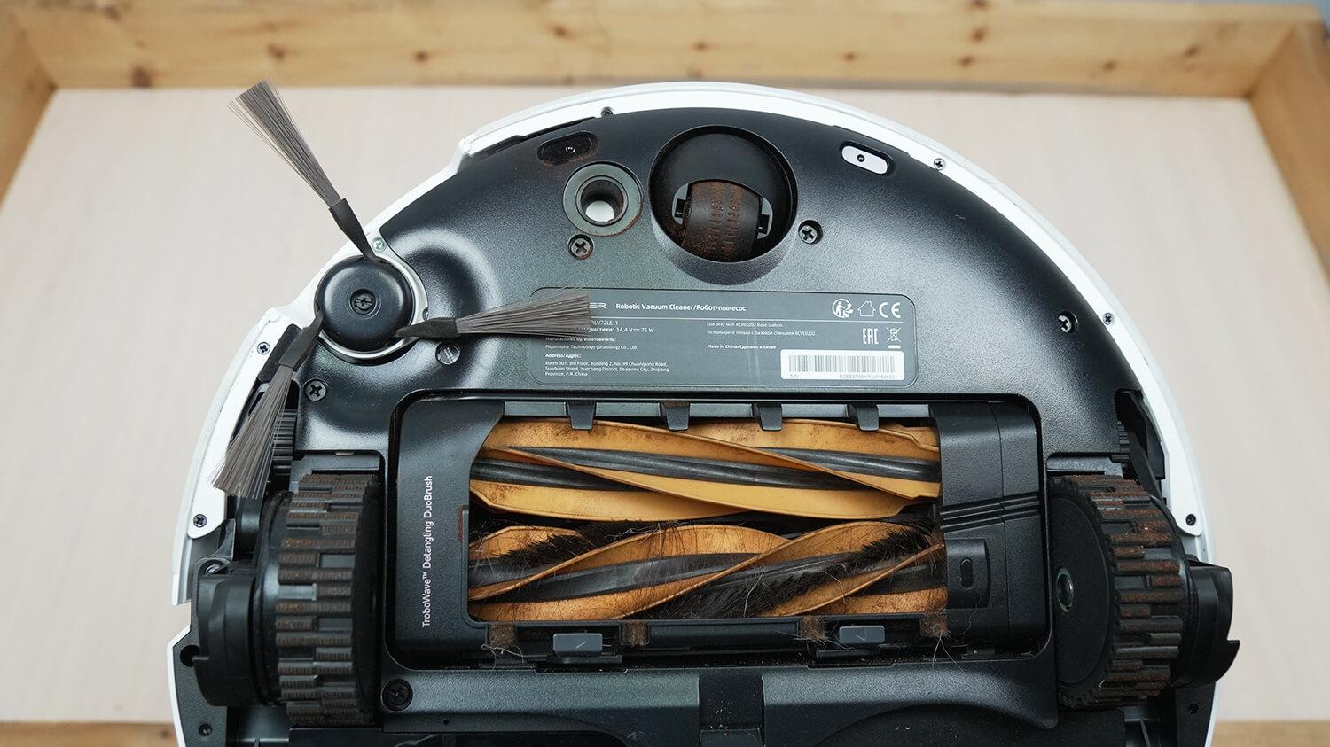 Посмотрим на состояние чистящего модуля. Видим, что основной удар на себя принял второй роллер с щетинистыми вставками, он прям намотал на себя волосы. Учитывая ограниченное пространство и большое количество мусора, пока что рано оценивать эффективность данного решения. Нужны дополнительные тесты.