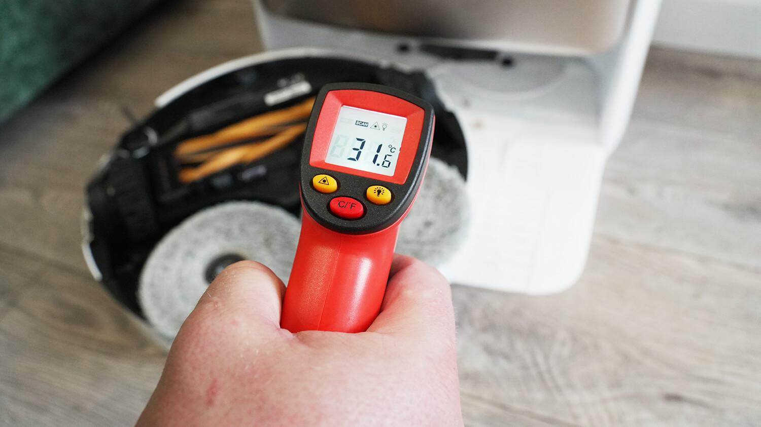 Также проверил температуру сушки пылесборника. Внутри контейнера в самом роботе датчик показал 33,5 градуса.