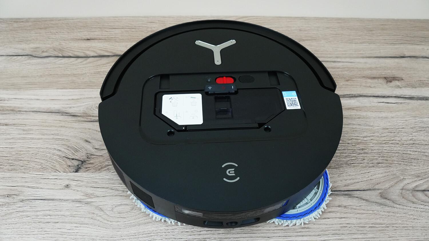 Пылесборник размещен под верхней крышкой. Там же видим кнопку включения/выключения питания и QR-код для подключения робота к приложению.